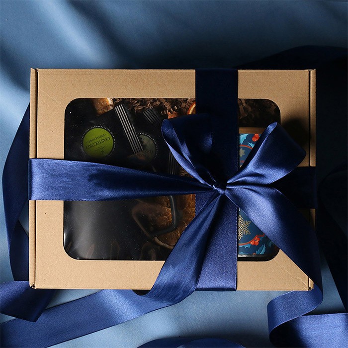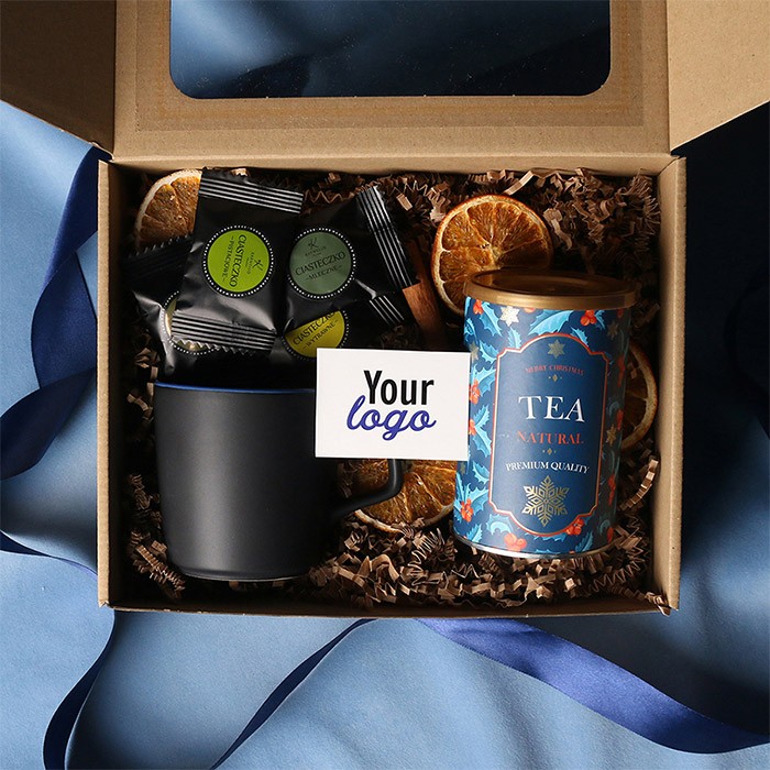 W skład zestawu wchodzą: kubek Barrel Supreme czarno-czwrwony / czarny-reflex blue / czarny-czarny z możliwością zdobienia, zielona herbata Sencha z wiśniami, płatkami róży zapakowana w tubę z motywem zimowym, 8 stuk czekoladek - mix smaków. Całość w stylowym opakowaniu z tektury eco z okienkiem. Opcje dodatkowej customizacji: nadruk na kubku, bilecik z logo firmy, wstążka lub obwoluta z motywem zimowym wzbogacona złoceniem.