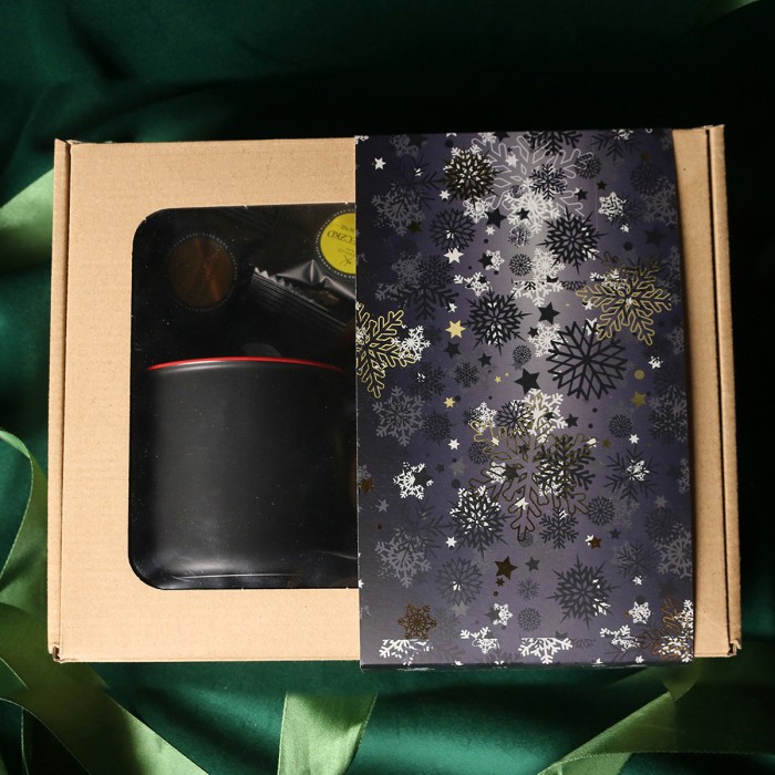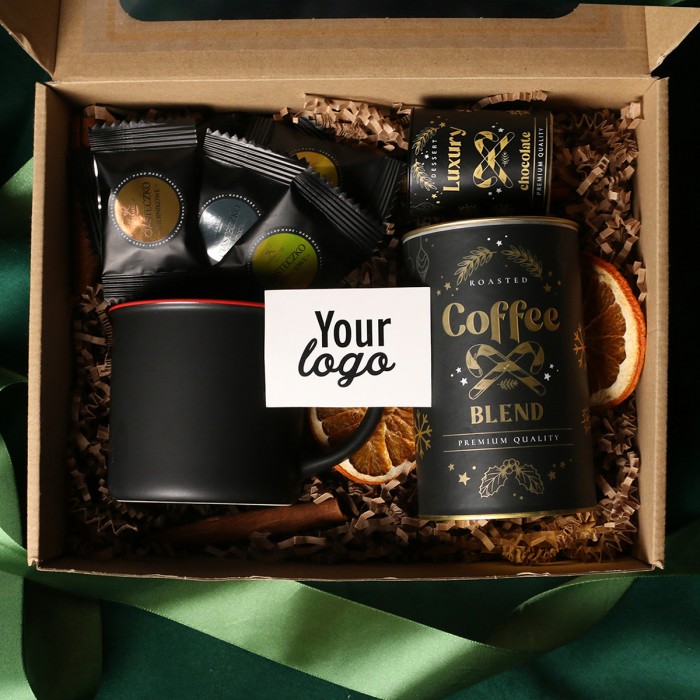 W skład zestawu wchodzą: kubek Loft ciemnozielony-biały / Loft Supreme czarny-czerwony / czarny-czarny z możliwością zdobienia, Arabica Cerrado Mineiro - kawa ziarnista zapakowana w tubę z motywem zimowym, 8 stuk czekoladek - mix smaków Luxury Chocolate - Czekolada Belgijska do picia w tubie z motywem zimowym. Całość w stylowym opakowaniu z tektury eco z okienkiem. Opcje dodatkowej customizacji: nadruk na kubku, bilecik z logo firmy, wstążka lub obwoluta z motywem zimowym wzbogacona złoceniem.