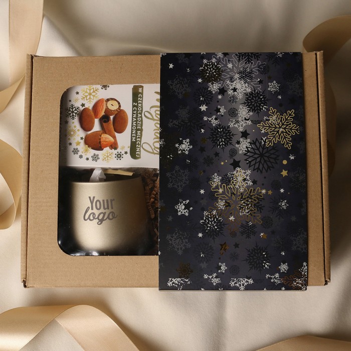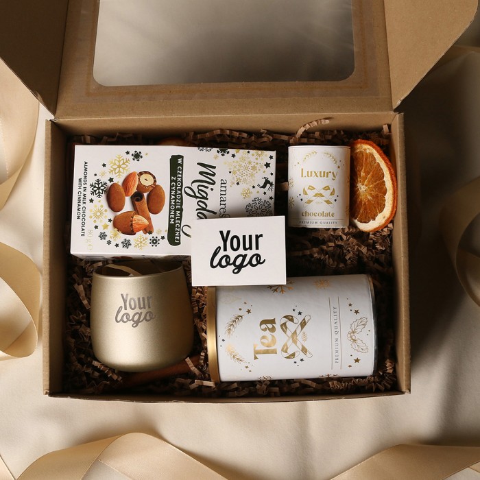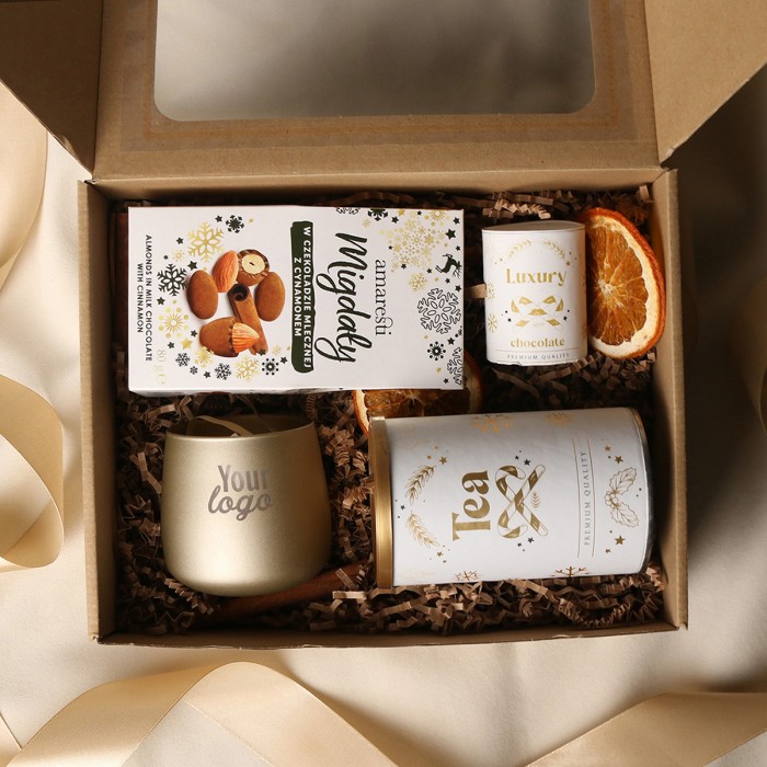 W skład zestawu wchodzą:Lampion Sensitive złoty mat (z t-light"em sojowym) z możliwością zdobienia, Amaresti Pralines- migdały w czekoladzie z cynamonem, zielona herbata Sencha z wiśniami, płatkami róży zapakowana w tubę z motywem zimowym, Luxury Chocolate - Czekolada Belgijska do picia w tubie z motywem zimowym. Całość w stylowym opakowaniu z tektury eco z okienkiem. Opcje dodatkowej customizacji: nadruk na lampionie, bilecik z logo firmy, wstążka lub obwoluta z motywem zimowym wzbogacona złoceniem.