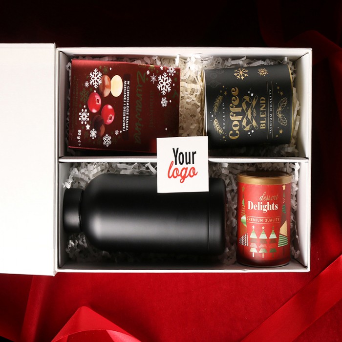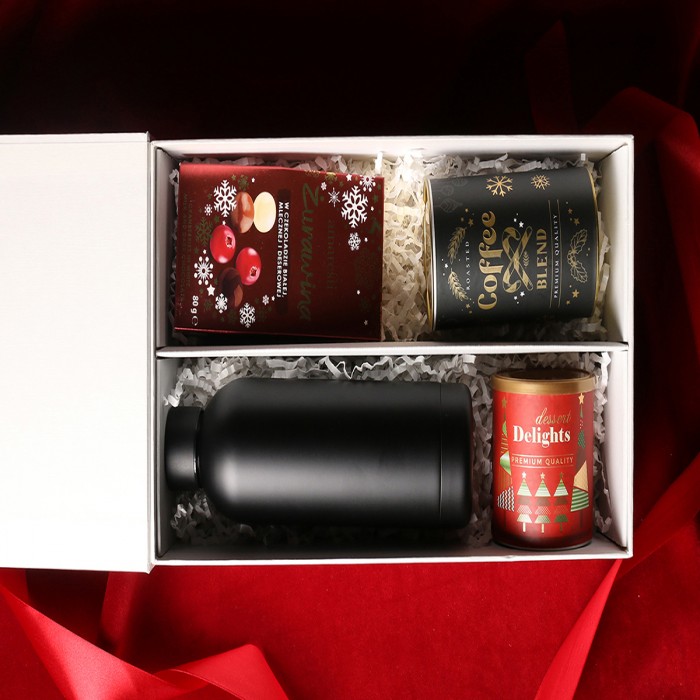W skład zestawu wchodzą: butelka termiczna Apollo czarna z możliwością zdobienia, Arabica Cerrado Mineiro - kawa ziarnista zapakowana w tubę z motywem zimowym, Amaresti Pralines - Żurawina w czekoladzie mlecznej i deserowej, Dessert Delights - Czarna porzeczka w białej czekoladzie, Całość w stylowym, śnieżnobiałym opakowaniu z magnesem. Opcje dodatkowej customizacji: nadruk na butelce, bilecik z logo firmy, wstążka lub obwoluta z motywem zimowym wzbogacona złoceniem.