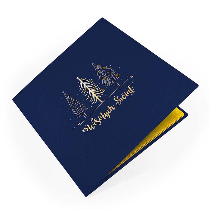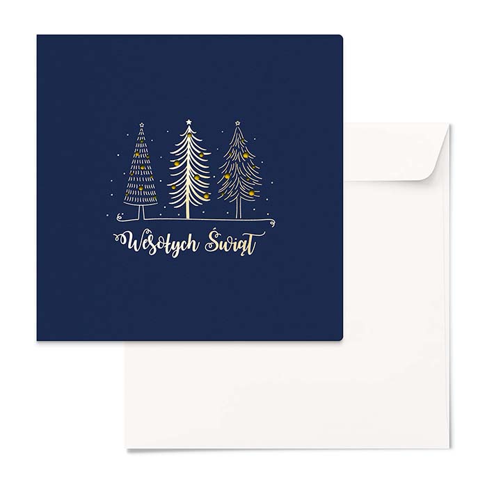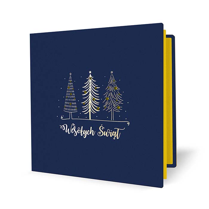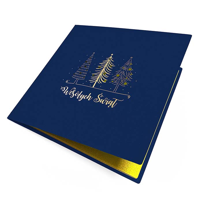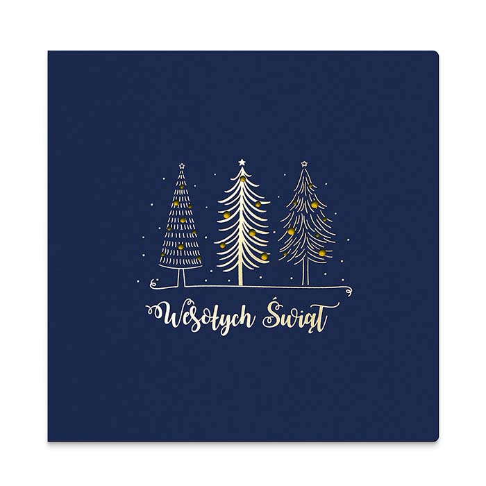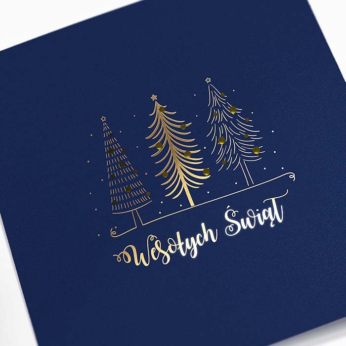 Elegancka kartka świąteczna w klasycznej kolorystyce granatu i złota. Na matowej, granatowej okładce umieszczono trzy stylizowane choinki, ozdobione złoceniem metodą hot print, a całość uzupełnia napis Wesołych Świąt w ozdobnym kroju pisma oraz subtelne cięcie laserowe bombek. Minimalistyczny, a zarazem efektowny projekt doskonale nadaje się do składania życzeń klientom i partnerom biznesowym.
