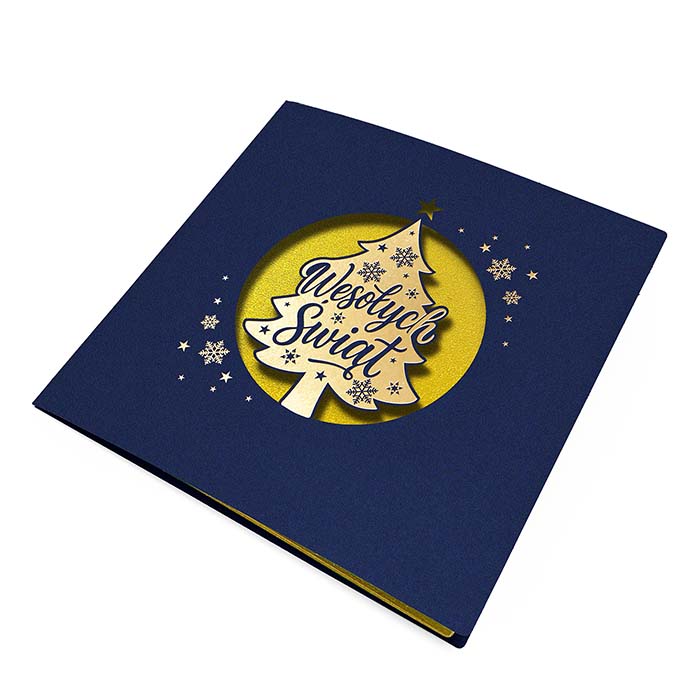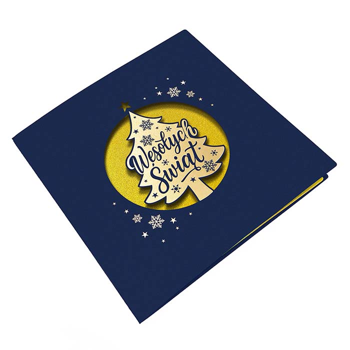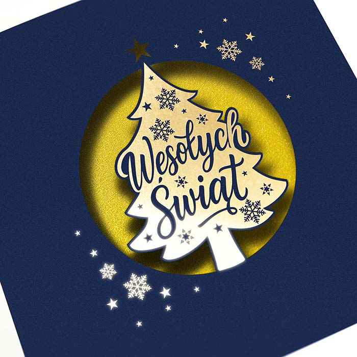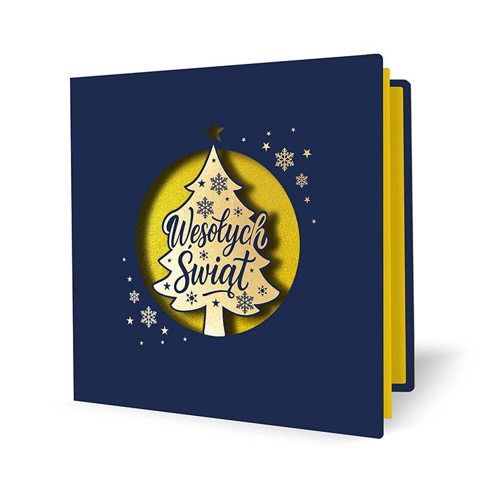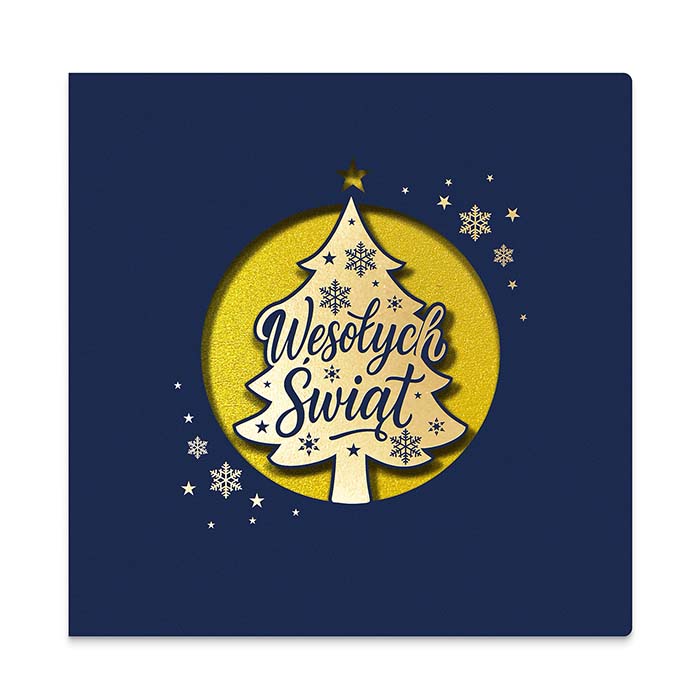 Nowoczesna kartka świąteczna o eleganckim charakterze, wykonana z granatowego matowego papieru. Centralnym elementem projektu jest laserowo wycięte okienko w kształcie koła, w którym znajduje się choinka z napisem Wesołych Świąt. Złote tło nadaje całości wyjątkowej głębi i efektu przestrzenności. Dookoła choinki rozmieszczono subtelne, złocone płatki śniegu, które wprowadzają świąteczny klimat i dodają kartce prestiżu.