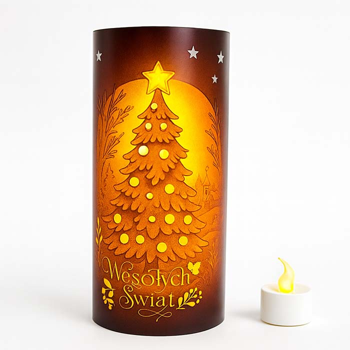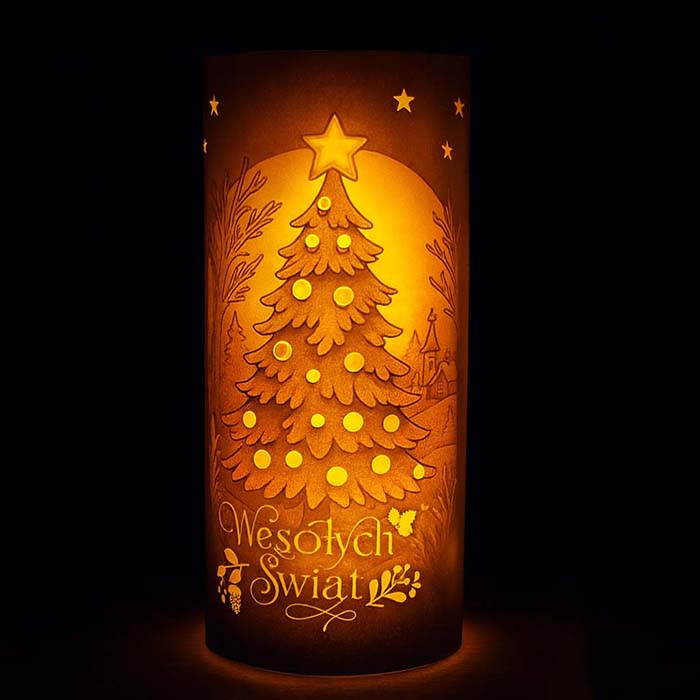 Lampion emituje ciepłe, przytulne światło dzięki zastosowaniu świeczki LED (dostępnej również w naszej ofercie). Laserowo wycinany motyw choinki z napisem "Wesołych Świąt" podkreśla jego wyjątkowy, świąteczny charakter.