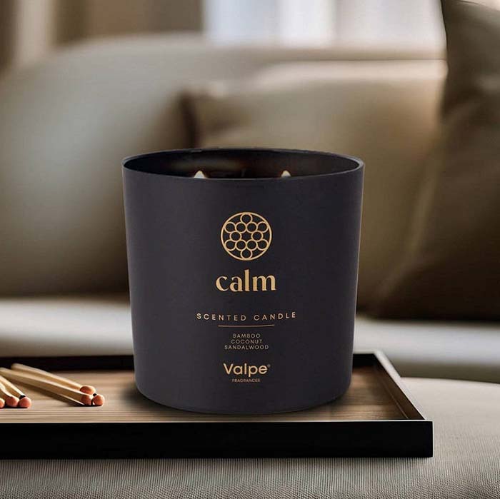 Nowość marki Valpe - świeca sojowa premium w matowym czarnym szkle ozdobionym eleganckim złotym nadrukiem, który podkreśla jej nowoczesny i prestiżowy charakter. Kompozycja zapachowa Calm została stworzona, aby wprowadzać w atmosferę relaksu, spokoju i harmonii. To polski produkt, który doskonale sprawdzi się jako biznesowy upominek, element pakietów świątecznych lub elegancki dodatek w przestrzeni biurowej.