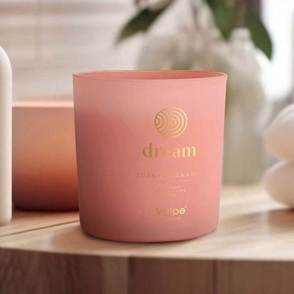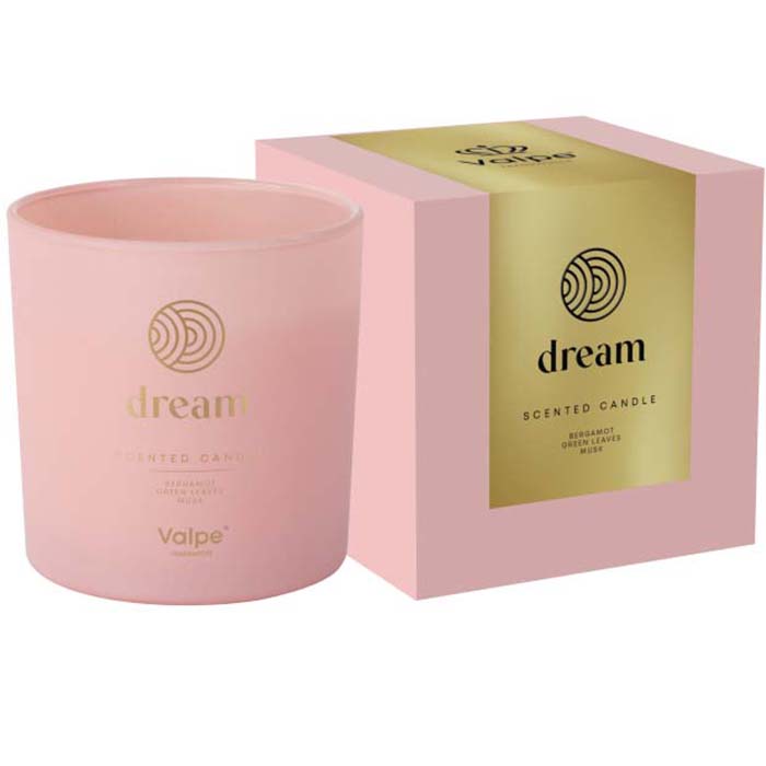 Nowość w ofercie marki Valpe - świeca sojowa premium w matowym różowym szkle zdobionym eleganckim złotym nadrukiem, który podkreśla jej nowoczesny i wyjątkowy charakter. Kompozycja zapachowa Dream została stworzona, aby wprowadzać w subtelny, relaksujący klimat, idealny do codziennego wyciszenia lub eleganckich wnętrz. To polski produkt, który sprawdzi się doskonale jako biznesowy prezent, element zestawów świątecznych czy upominek dla klientów i partnerów.
