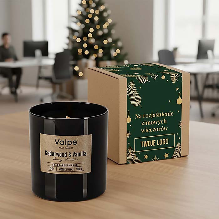 Świeca sojowa premium z drewnianym knotem, wpisująca się w najnowsze trendy. Łączy elegancki, nowoczesny wygląd z ekologicznym charakterem oraz unikalnym zapachem drzewa cedrowego połączonego z wanilią. Podczas palenia naturalny drewniany knot wydaje subtelny dźwięk trzaskającego drewna, tworząc nastrojową atmosferę niczym przy kominku. To polski produkt, który idealnie sprawdzi się jako biznesowy upominek, element zestawu prezentowego lub prestiżowy gadżet firmowy.