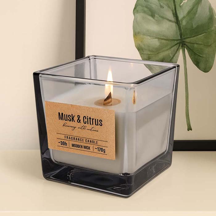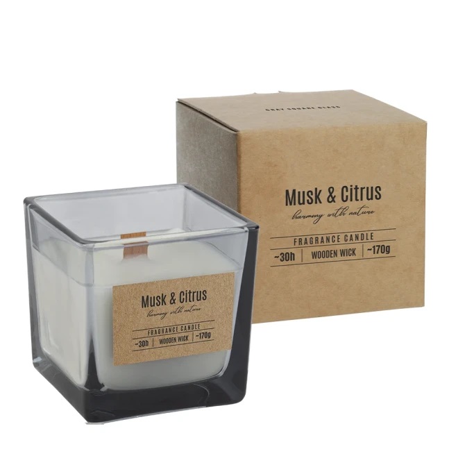 Świeca sojowa premium w kwadratowym szkle z drewnianym knotem, idealnie wpisująca się w najnowsze trendy. Łączy nowoczesny i elegancki wygląd z ekologicznym charakterem oraz wyjątkowym zapachem piżma i cytrusów. Podczas palenia naturalny drewniany knot wydaje subtelny dźwięk trzaskającego drewna, przywołując klimat domowego kominka. To polski produkt, który sprawdzi się doskonale jako biznesowy prezent, element zestawów upominkowych czy elegancki gadżet firmowy.