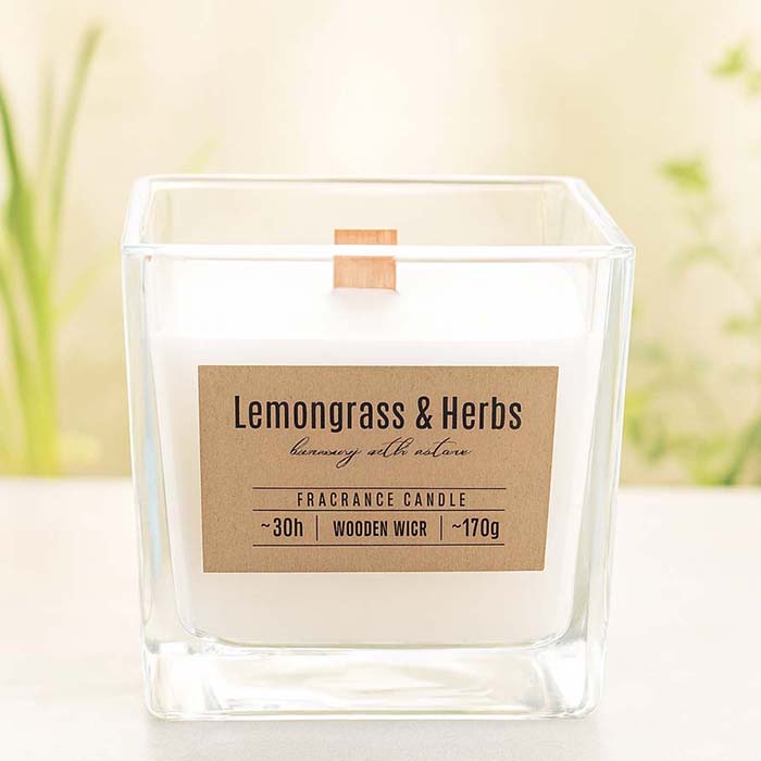 Świeca sojowa premium w kwadratowym szkle z drewnianym knotem, doskonale wpisująca się w obecne trendy. Łączy nowoczesny i elegancki wygląd z ekologicznym charakterem oraz wyjątkowym zapachem trawy cytrynowej i aromatycznych ziół. Podczas palenia naturalny drewniany knot wydaje subtelny dźwięk trzaskającego drewna, wprowadzając atmosferę niczym przy kominku. To polski produkt, który świetnie sprawdzi się jako biznesowy upominek, element zestawów świątecznych czy elegancki prezent dla klientów i kontrahentów.
