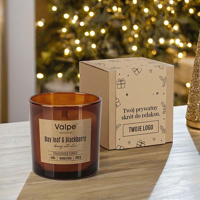 Świeca sojowa premium z drewnianym knotem, idealnie wpisująca się w najnowsze trendy. Łączy elegancki i nowoczesny wygląd z ekologicznym charakterem oraz wyjątkowym zapachem liścia laurowego i jeżyny. Podczas palenia naturalny drewniany knot wydaje subtelny dźwięk trzaskającego drewna, tworząc atmosferę niczym przy kominku. To polski produkt, który świetnie sprawdzi się jako prestiżowy upominek biznesowy, element świątecznych zestawów prezentowych lub elegancki gadżet firmowy.