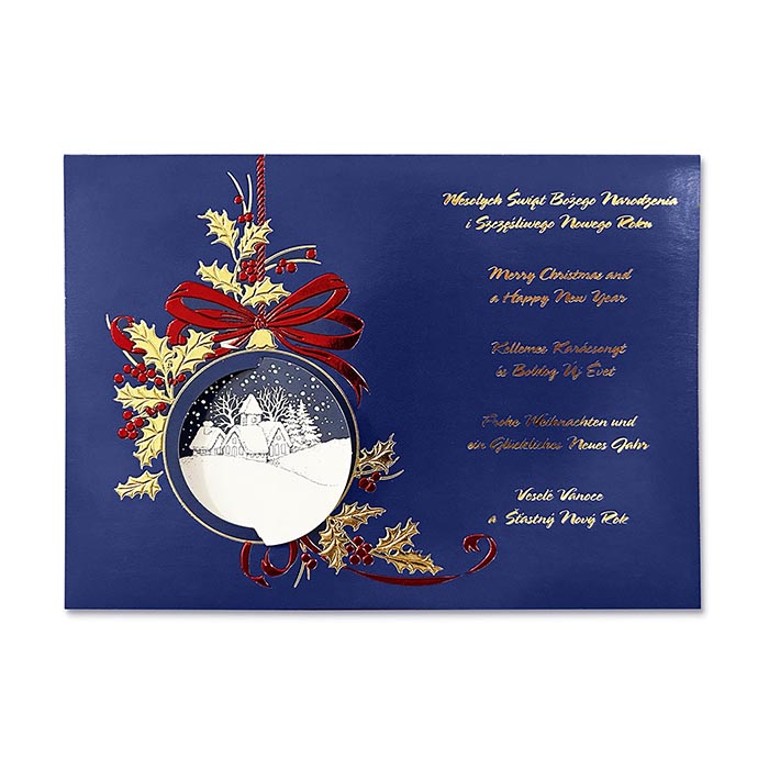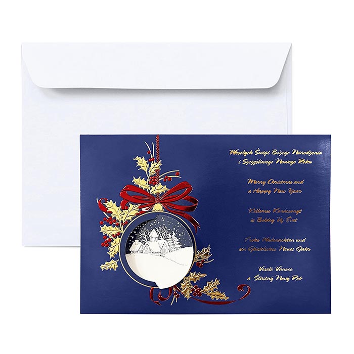 Kartki świąteczne wykonane z eleganckiego papieru z nadrukiem w kolorze głębokiego granatu. Na okładce znajduje się misterny motyw bombki świątecznej z zimowym pejzażem, ozdobionej czerwonymi i złotymi detalami. Projekt wykonano z najwyższą precyzją, wykorzystując technikę hotstampingu w kolorze złotym, która nadaje całości wyjątkowego blasku i prestiżu.