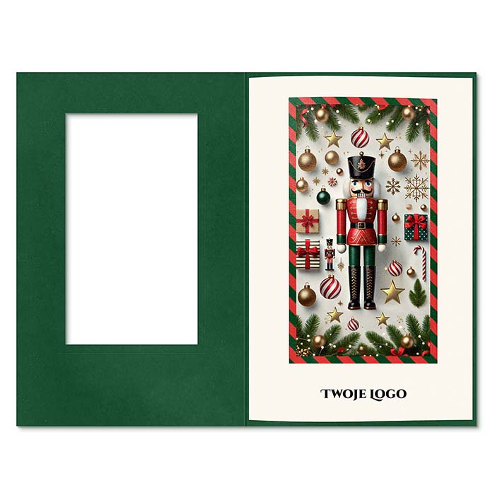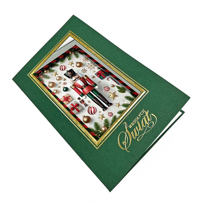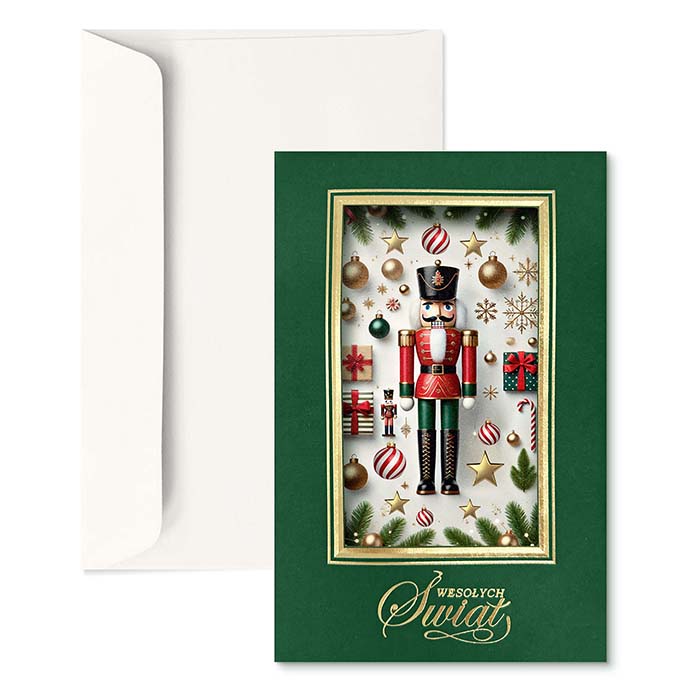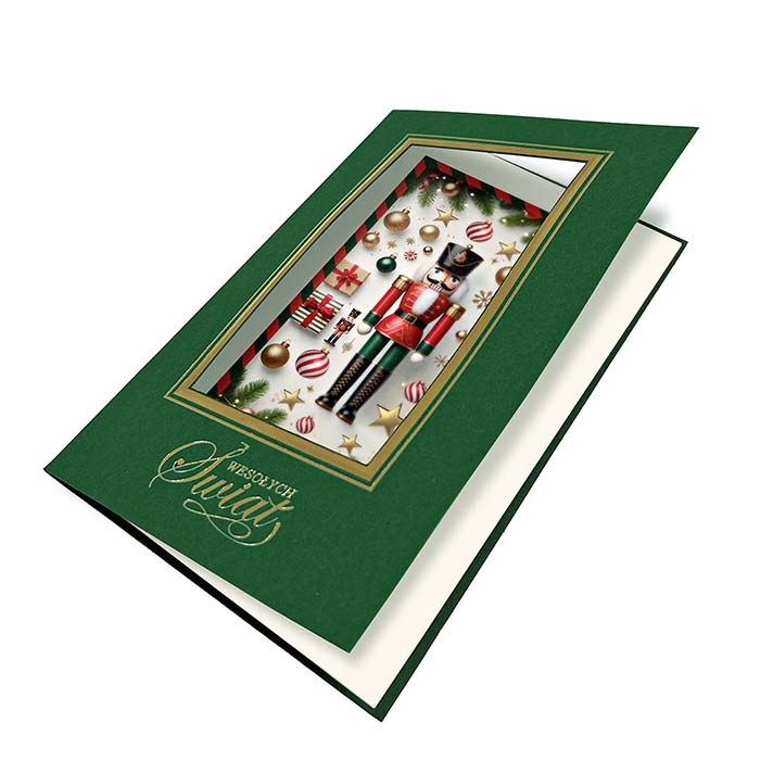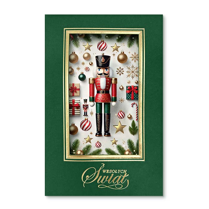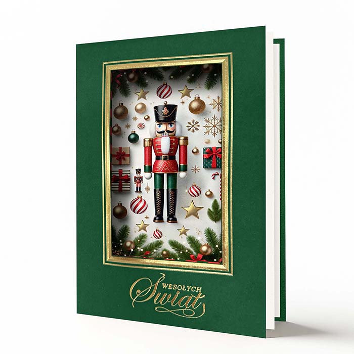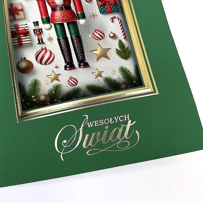 Elegancka kartka świąteczna inspirowana klasycznym motywem Dziadka do orzechów - symbolem tradycji i świątecznego ciepła. Na zielonej, matowej okładce wykonano złotą ramkę i otwór przez który widoczna jest  nadrukowana kompozycja przedstawiająca figurkę Dziadka do orzechów otoczoną prezentami, laskami cukrowymi i śnieżynkami. Całość dopełnia złocony napis Wesołych Świąt wykonany techniką hot print. Kartka zachwyca bogactwem detali i eleganckim kontrastem kolorów, idealnie wpisując się w styl premium.