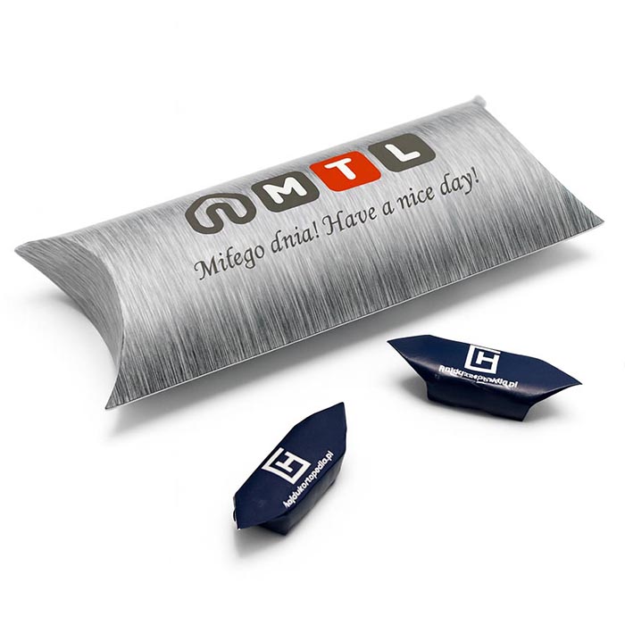 Eleganckie i nowoczesne pudełka firmowe typu "poduszka", idealne na krówki, drobne upominki lub gadżety reklamowe. Wykonane z wysokiej jakości, sztywnego kartonu, dzięki czemu prezentują się wyjątkowo profesjonalnie i stylowo.