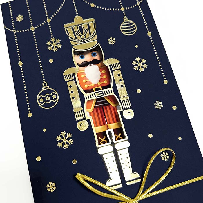 Elegancka kartka świąteczna wykonana z wysokiej jakości papieru barwionego w masie w głębokim odcieniu granatu. Na okładce znajduje się stylizowany motyw klasycznego Dziadka do orzechów - symbolu magii Świąt - ozdobiony złoceniem i drobnymi detalami wykonanymi techniką hotstampingu. Całość dopełniają zawieszone dekoracje, śnieżynki i elegancka wstążka ze złotej folii, która nadaje karcie wyjątkowego, teatralnego charakteru.