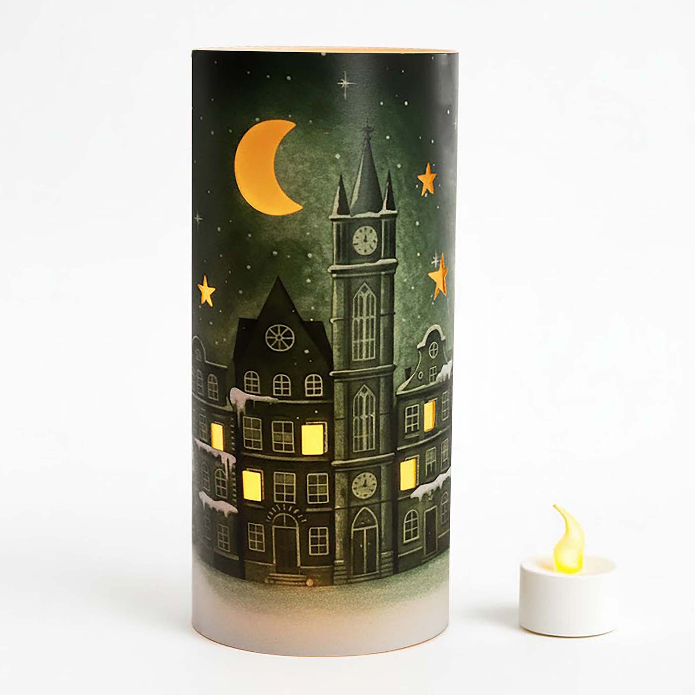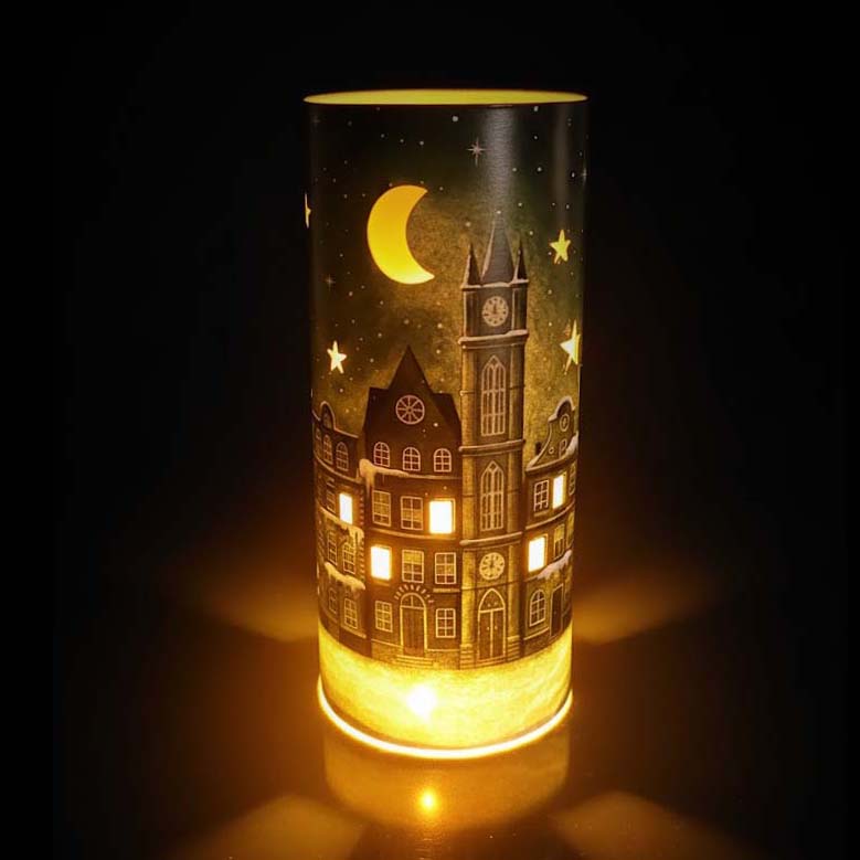 Delikatnie rozproszone światło świeczki LED podkreśla detale nadruku - kamieniczki, wieżę zegarową, gwiazdy i księżyc, tworząc przytulny, świąteczny klimat.