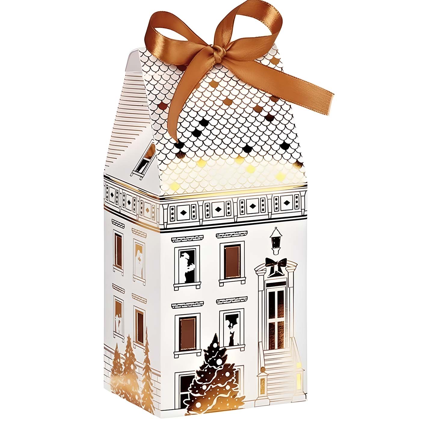 Wprowadź do swojej oferty odrobinę świątecznego uroku dzięki eleganckiemu pudełku tekturowemu w kształcie domku "Festive City". To wyjątkowe opakowanie w kolorze białym ze złotymi akcentami, ozdobione satynową wstążką i tłoczeniem na gorąco, zachwyca swoim designem i dbałością o każdy detal.