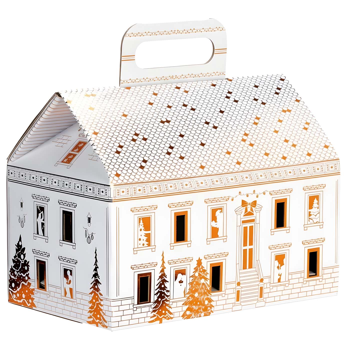 Eleganckie pudełko tekturowe w kształcie domku "Festive City" to opakowanie stworzone z myślą o świątecznych aranżacjach i prezentacjach delikatesowych produktów. Wykonane z wysokiej jakości tektury, utrzymane w biało-złotej kolorystyce, zachwyca elegancją i świątecznym charakterem.