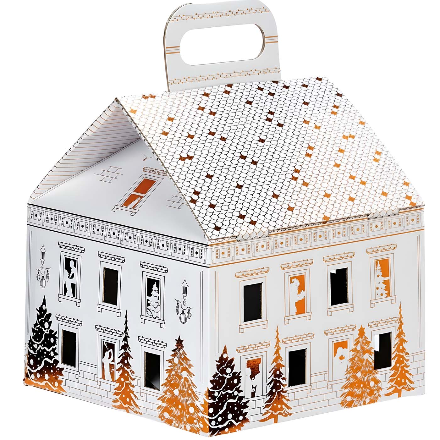 Pudełeko w kształcie domku, idealnych do przechowywania i pakowania prezentów na każdą okazję. Pudełko tekturowe FESTIVE CITY w kolorze białym i złotym doskonale wpasują się w świąteczny oraz uroczysty klimat.