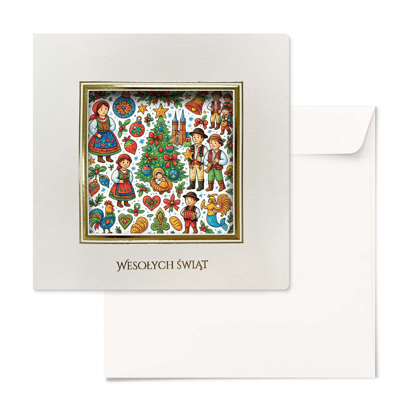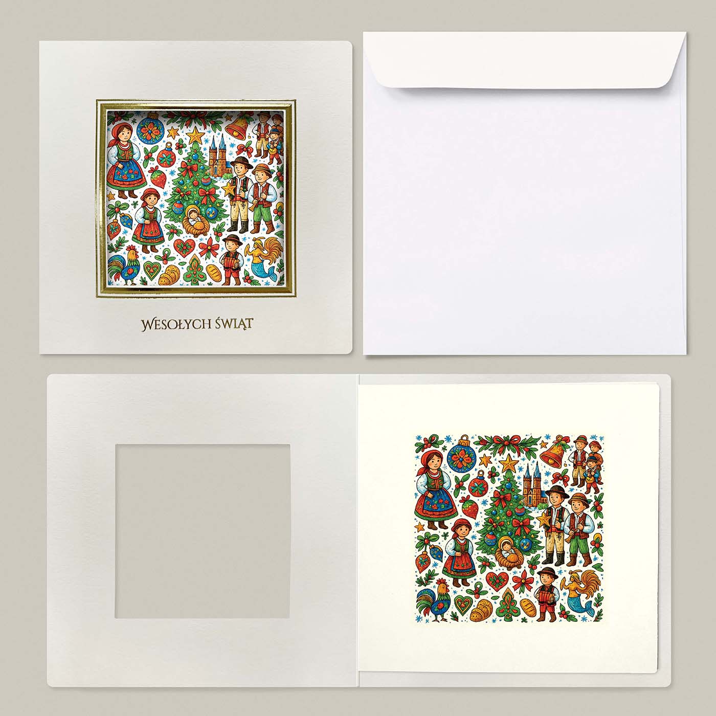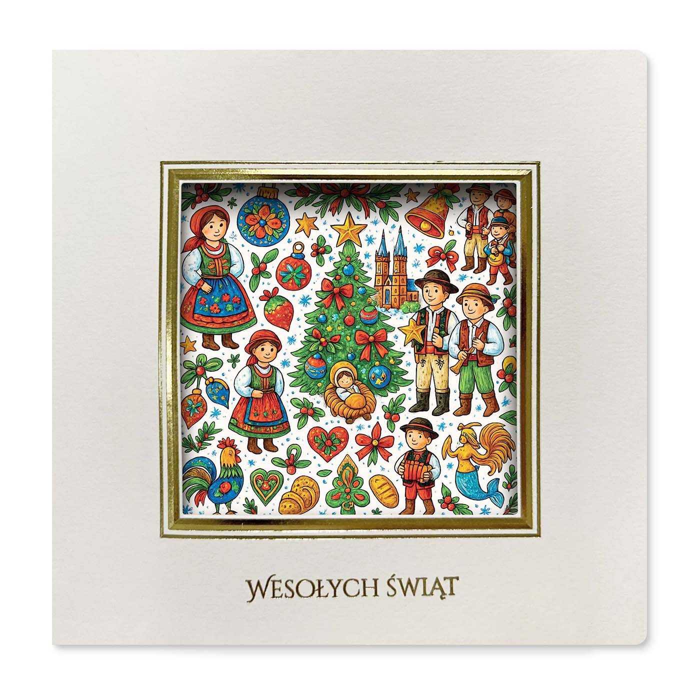 Na froncie znajduje się bogato ilustrowana scena pełna tradycyjnych motywów: stroje ludowe, świąteczne symbole, dekoracyjne serca, choinka oraz ciepła scena narodzenia. Kolorowa, radosna kompozycja nadaje kartce wyjątkowo przyjazny i autentyczny charakter.