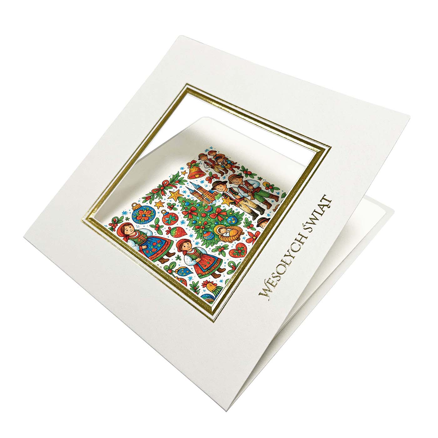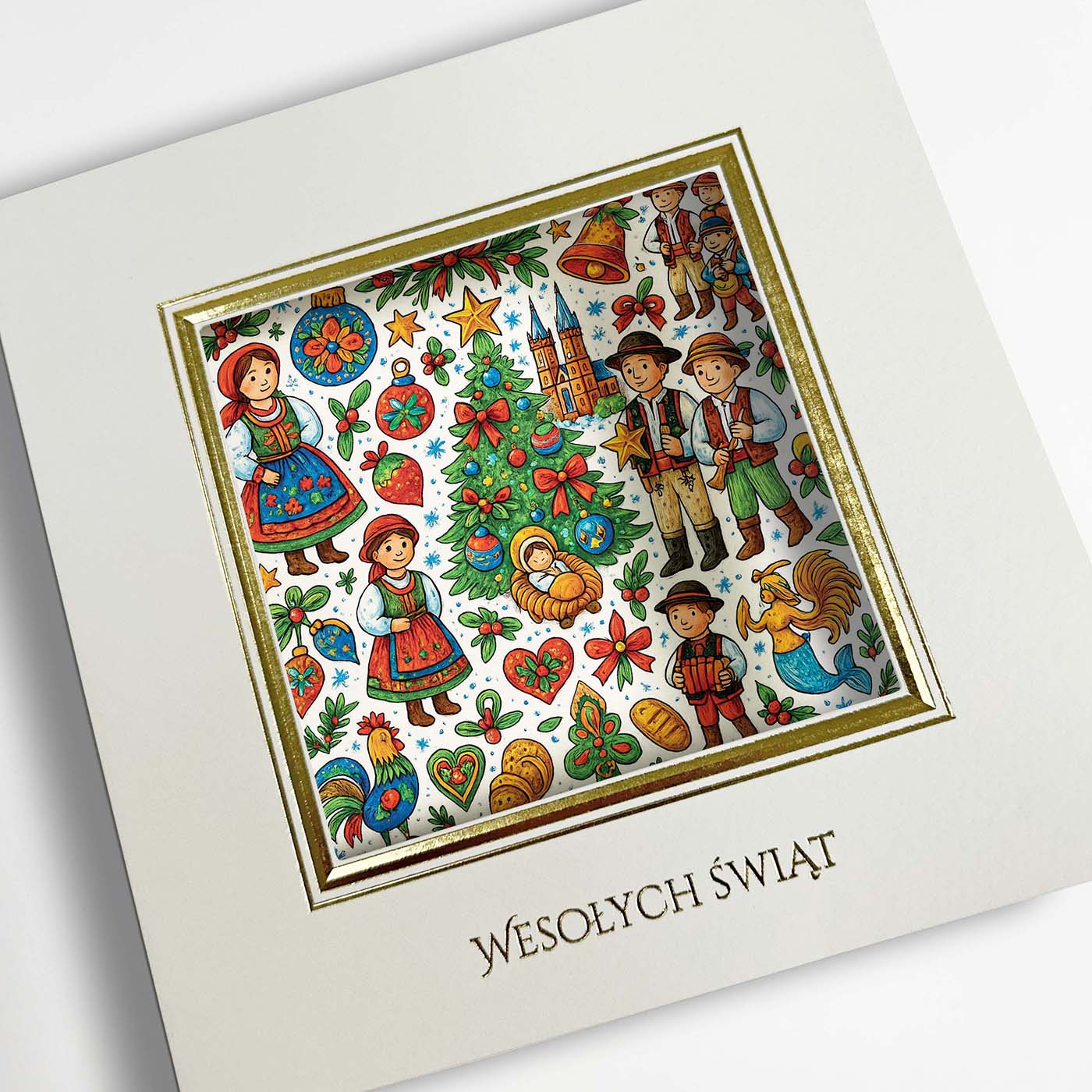 Całość została wykonana na wysokiej jakości, matowym papierze premium, z elegancką złotą ramką podkreślającą centralny panel. Typografia "Wesołych Świąt" utrzymana jest w klasycznym stylu, który dodaje kartce profesjonalnego charakteru.
