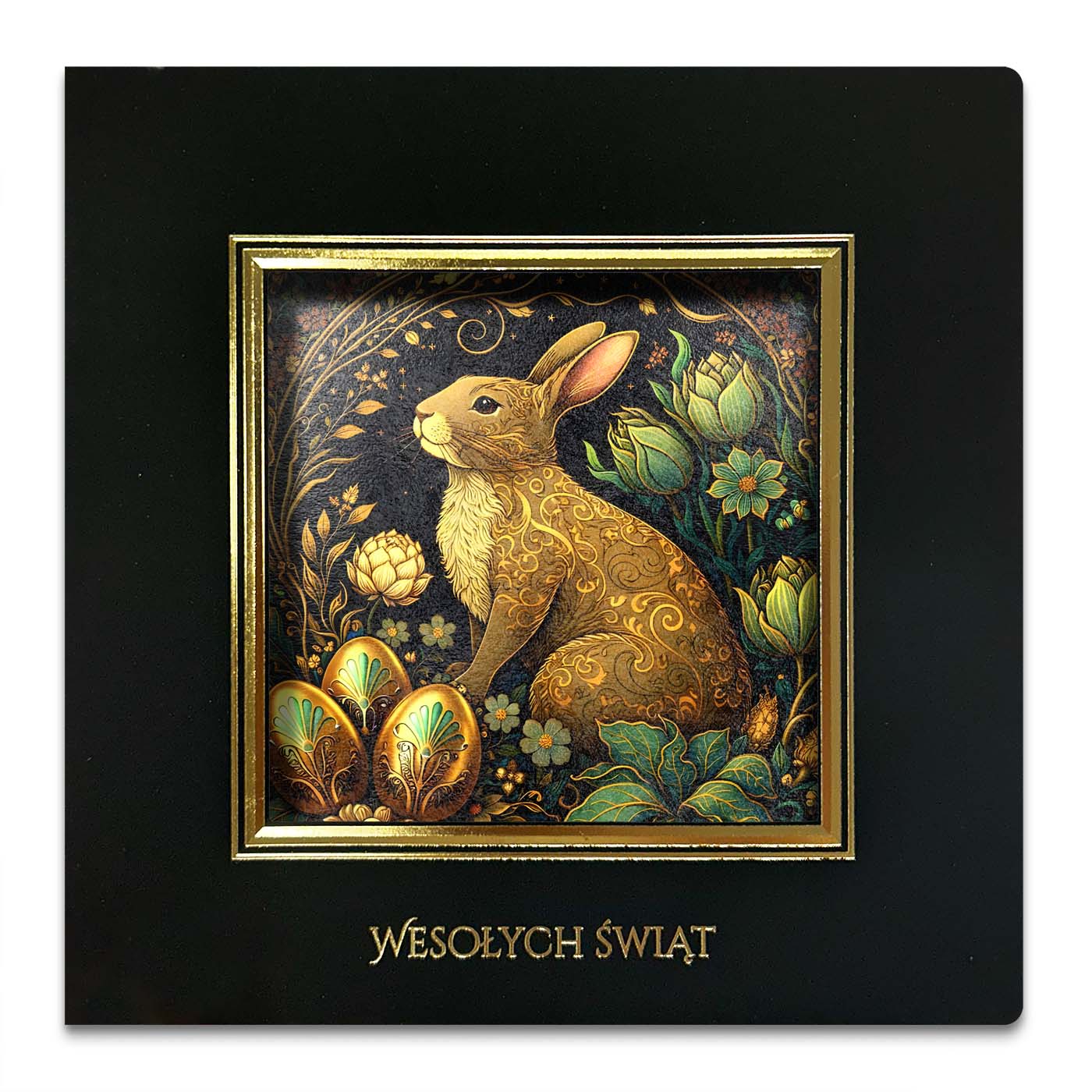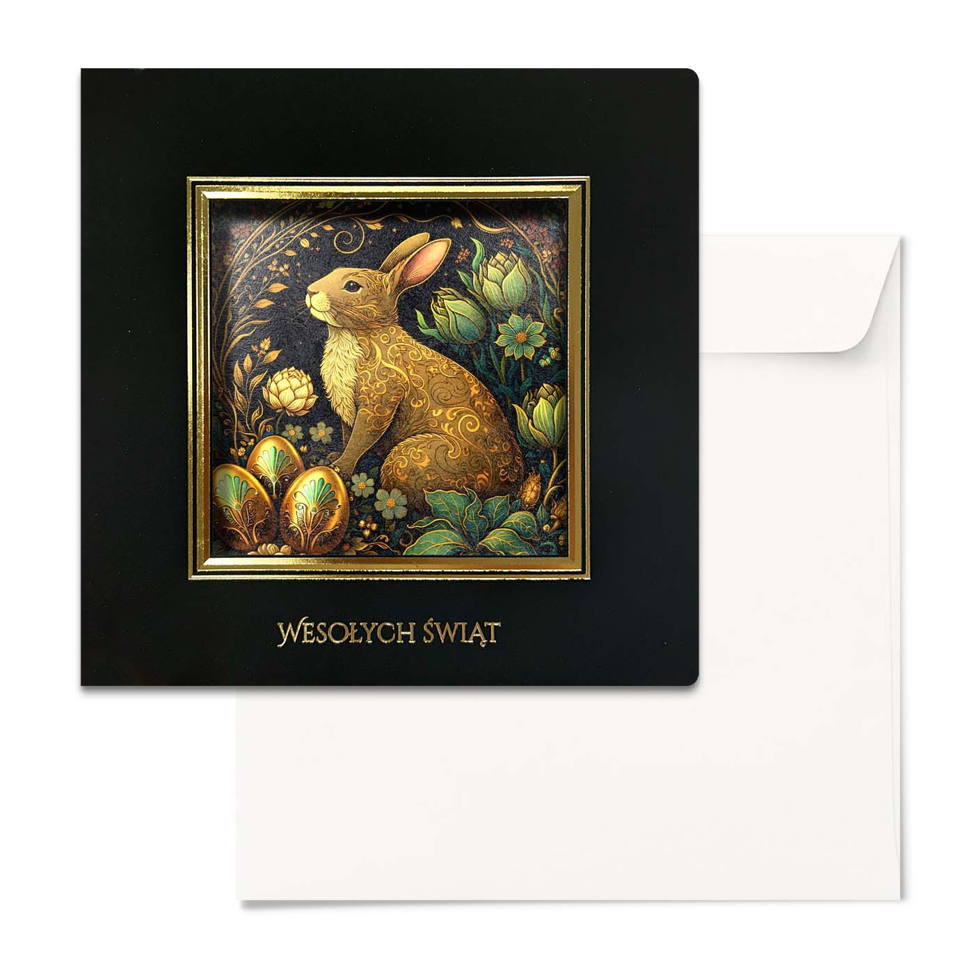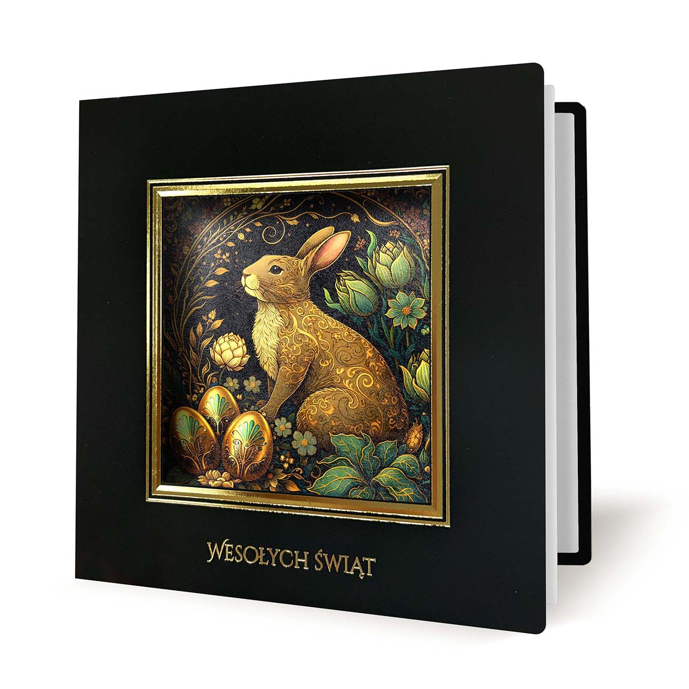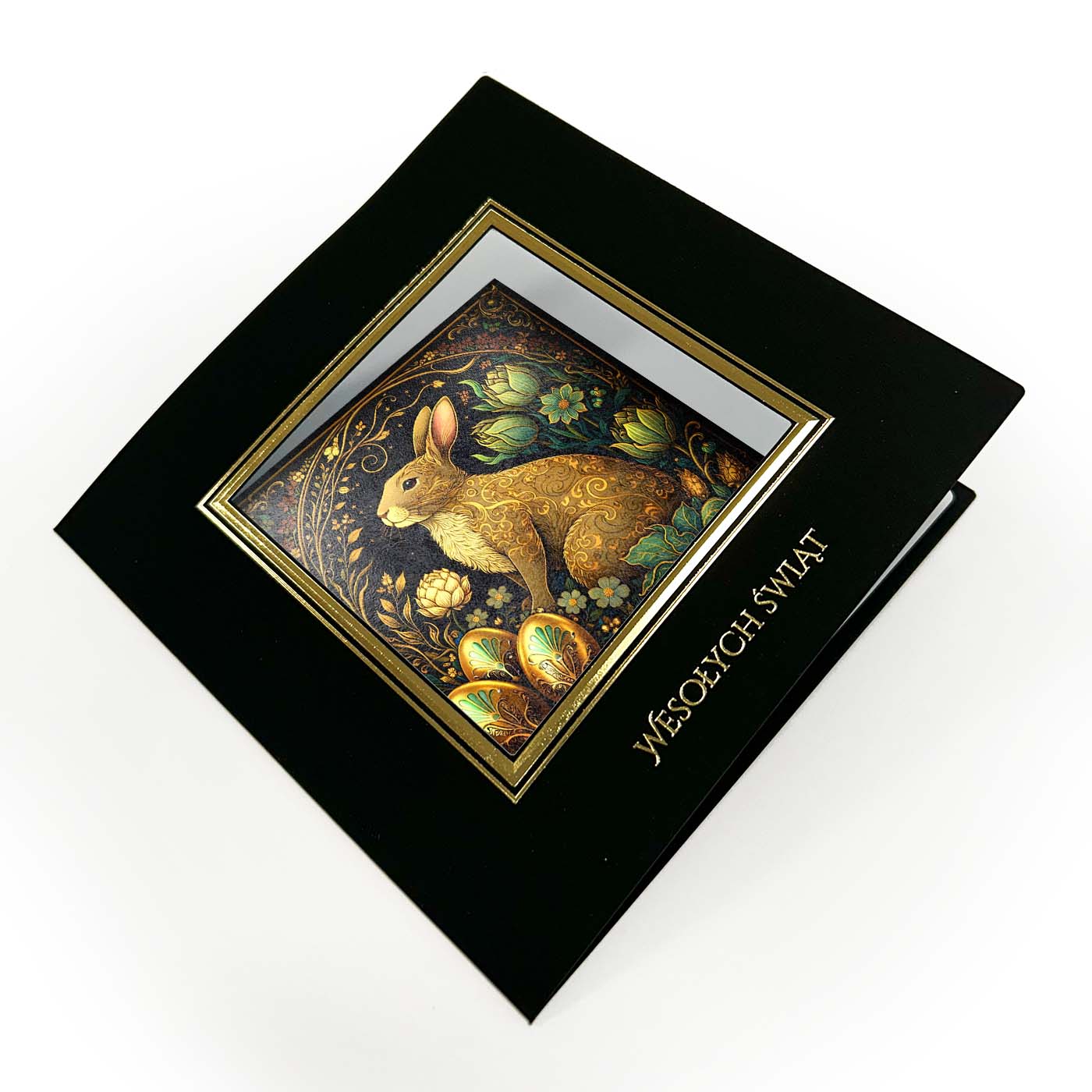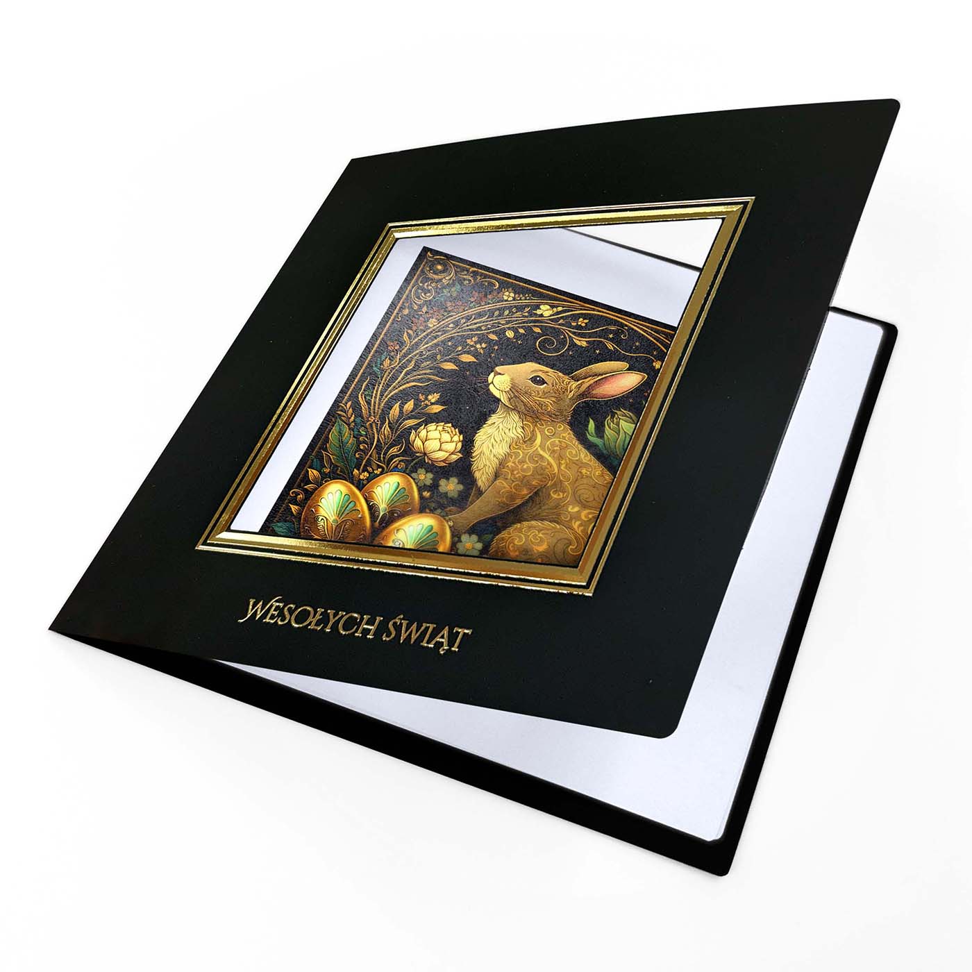 Artystycznie zaprojektowana kartka wielkanocna o wyraźnie eleganckim, klasycznym charakterze, stworzona z myślą o odbiorcach ceniących wysoką estetykę i szlachetne materiały. Okładka wykonana z ozdobnego papieru barwionego w masie w głębokiej, eleganckiej czerni stanowi doskonałe tło dla złoconej, trójwymiarowej ramki, która nadaje całości prestiżowy i wyrafinowany wygląd.