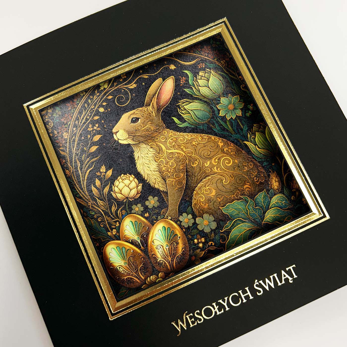 W centralnej części znajduje się nadruk zajączka wielkanocnego, utrzymany w eleganckim, ilustracyjnym stylu. Kompozycja przywodzi na myśl klasyczne ryciny i dekoracyjne ilustracje, tworząc efekt luksusowej kartki premium.