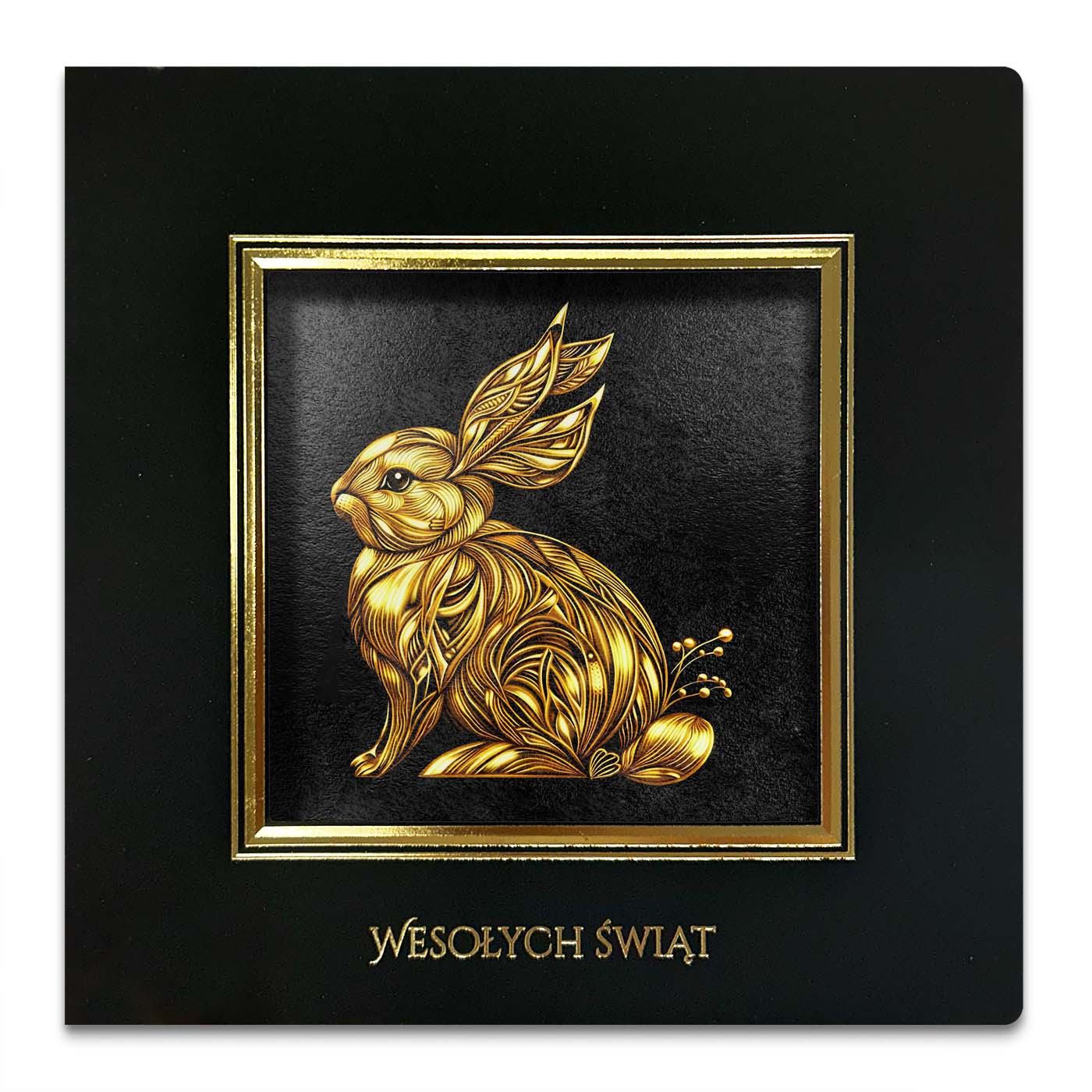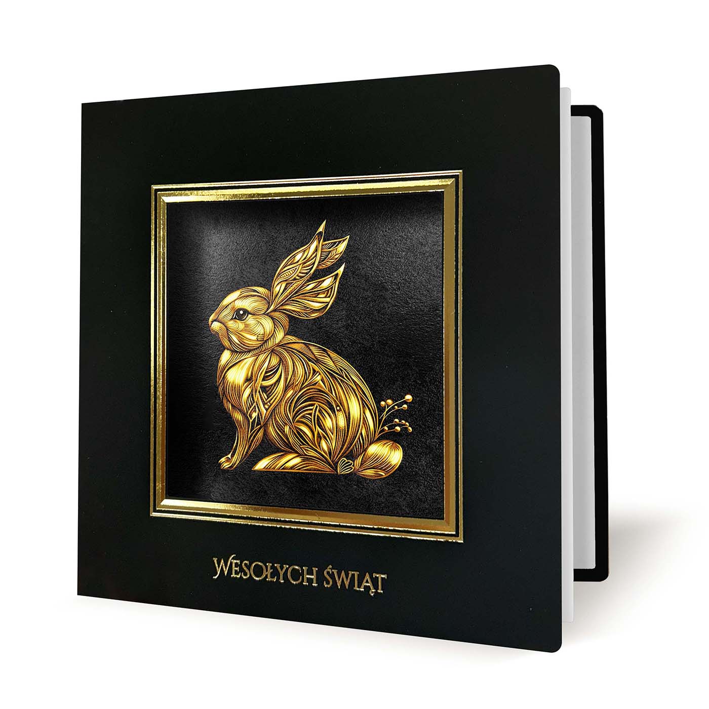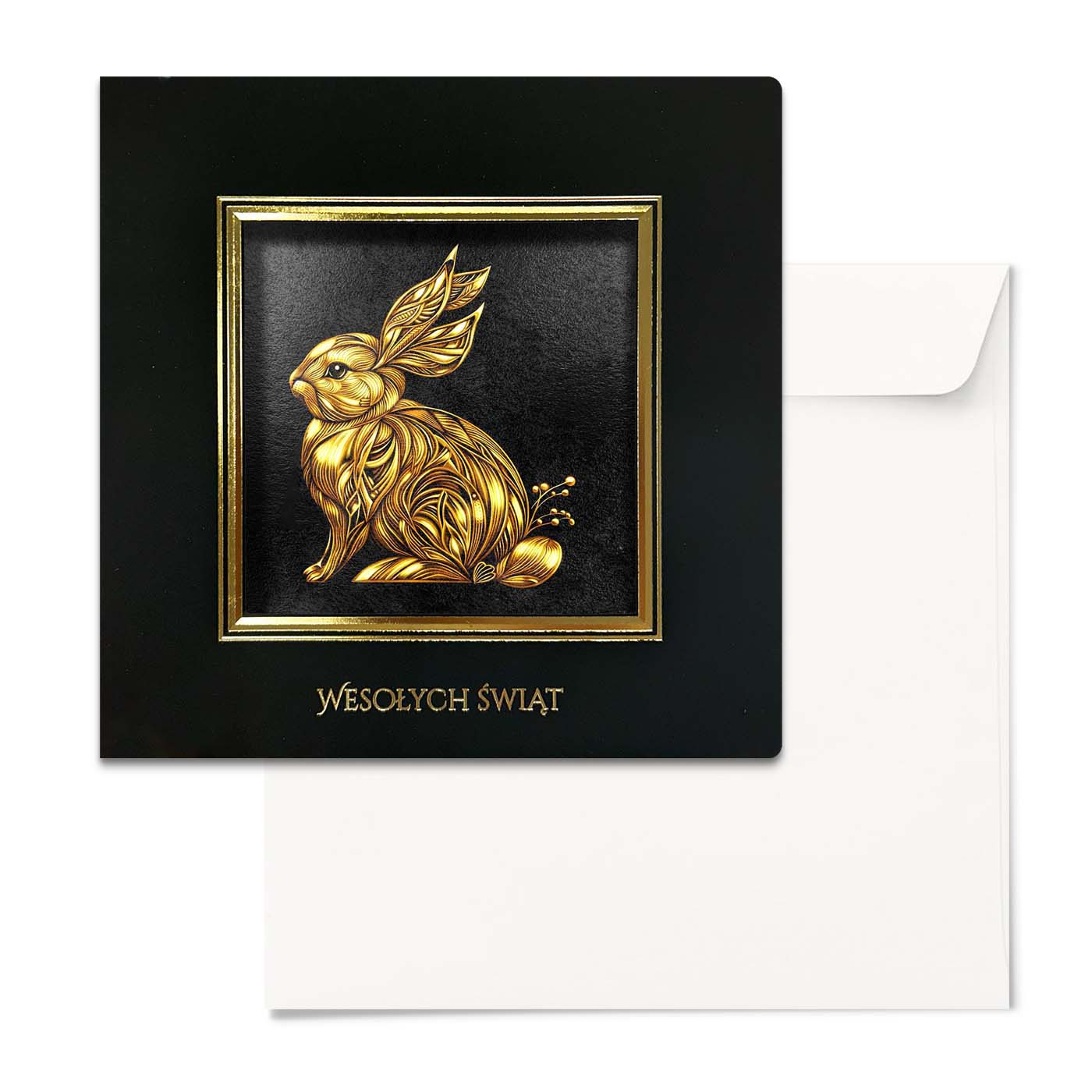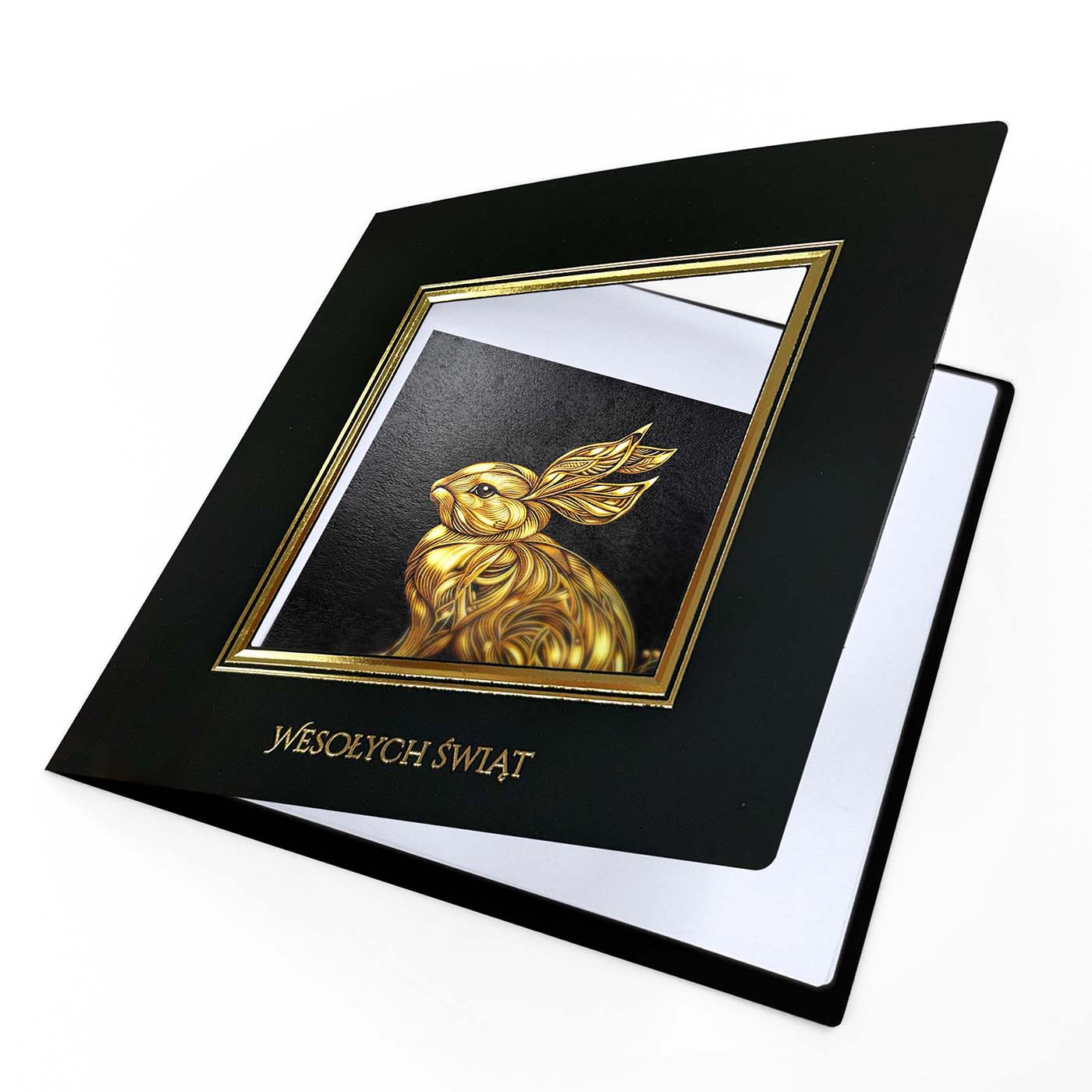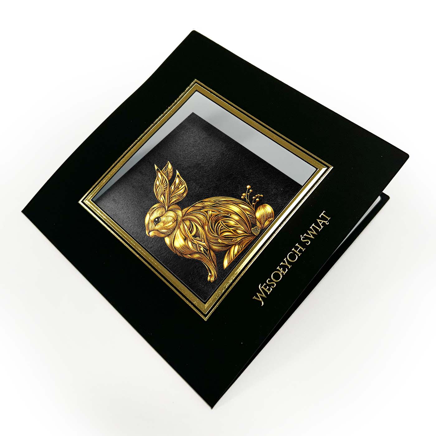 Kartka wielkanocna o wyjątkowo eleganckim, klasycznym charakterze. Okładka wykonana z ozdobnego papieru barwionego w masie w głębokiej, eleganckiej czerni stanowi idealne tło dla złoconej, trójwymiarowej ramki, która podkreśla prestiżowy i ekskluzywny charakter kartki.