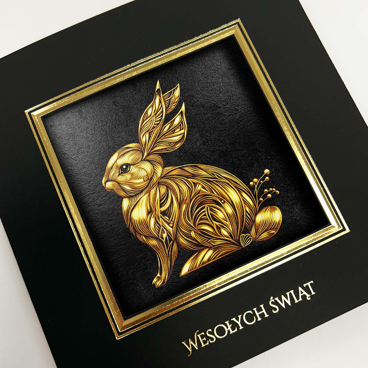 W centralnej części znajduje się artystyczny nadruk złotego zajączka wielkanocnego, przedstawionego w dekoracyjnym, ilustracyjnym stylu inspirowanym klasycznym ornamentem i finezyjną linią. Minimalistyczna kolorystyka czerni i złota sprawia, że projekt jest ponadczasowy i niezwykle wyrafinowany.