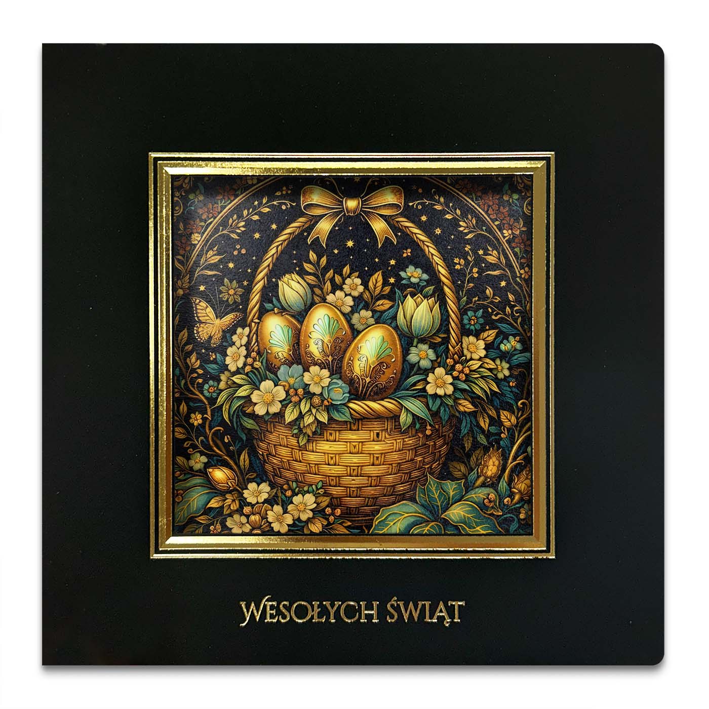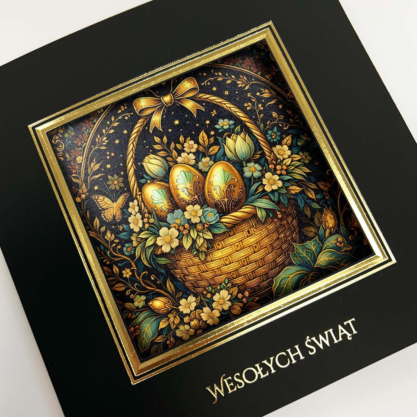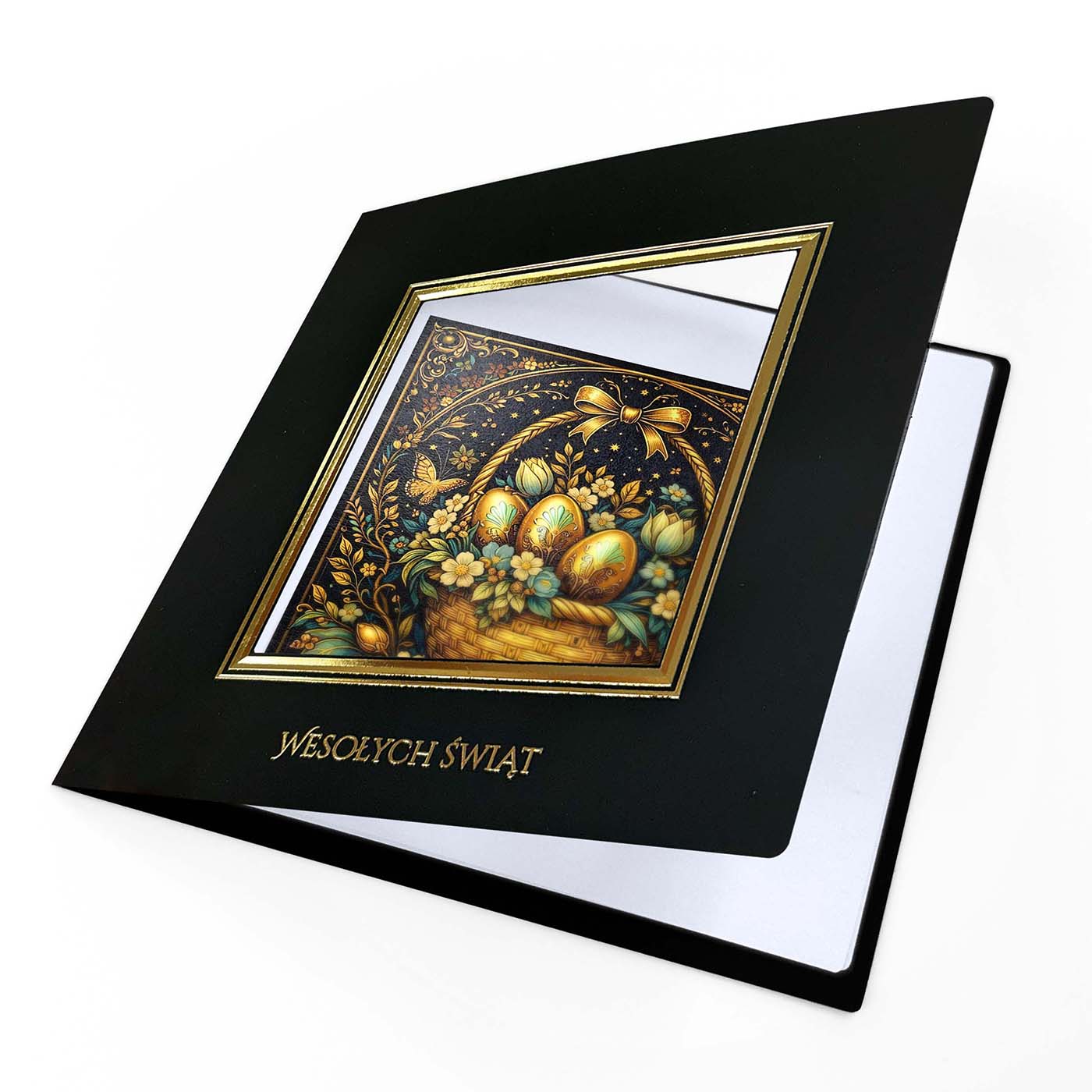 Kartka wielkanocna o eleganckim, klasycznym charakterze, stworzona z myślą o osobach ceniących wysoką estetykę, tradycyjne motywy świąteczne oraz szlachetne materiały. Okładka wykonana z ozdobnego papieru barwionego w masie w głębokiej, eleganckiej czerni stanowi doskonałe tło dla złoconej, trójwymiarowej ramki, która nadaje całości prestiżowy i wyrafinowany wygląd.
