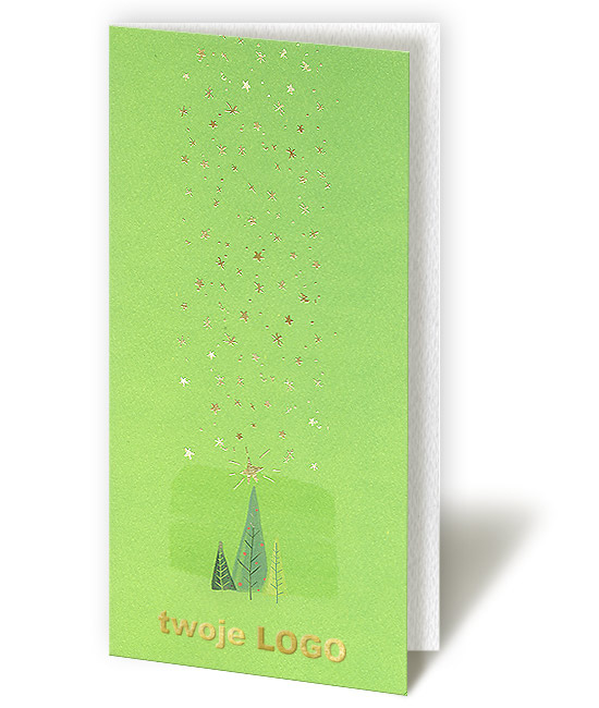 KARTA ZAPROJEKTOWANA PRZEZ NAJLEPSZYCH PROJEKTANTÓW Z BARCELONY!!! Wykonana z delikatnie fakturowanego papieru. W dolnej części nadrukowane drzewka świąteczne. Ponad nimi duża wyzłocona gwiazda, a jeszcze powyżej drobniutkie złocone gwiazdki. Nadruk życzeń wykonujemy na wkładce.