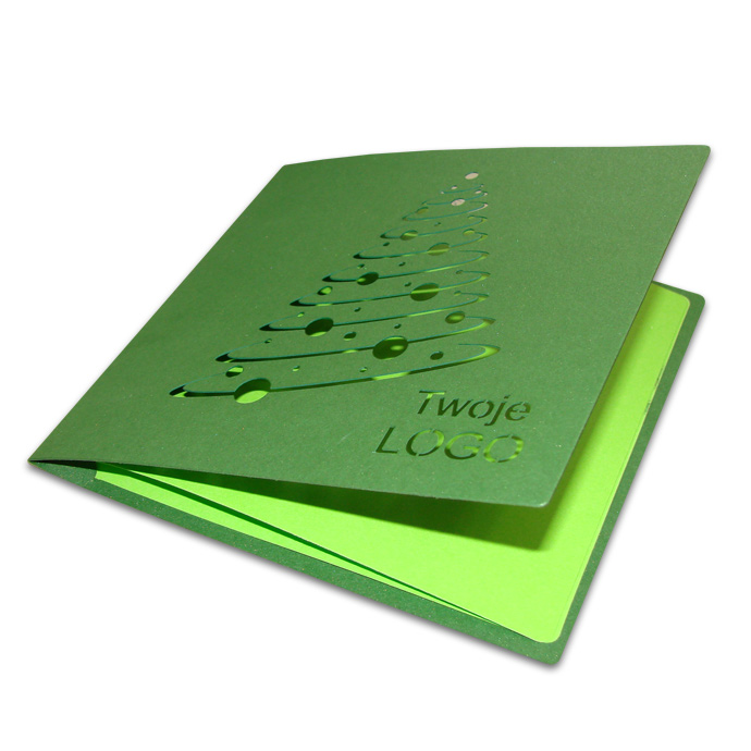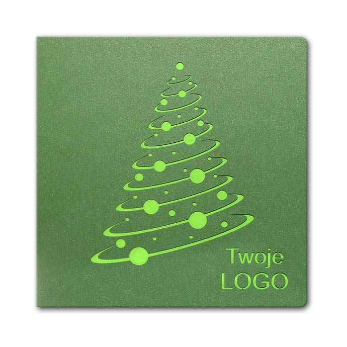Nowoczesna kartka świąteczna o harmonijnym, monochromatycznym charakterze, wykonana z metalizowanego papieru w głębokim odcieniu zieleni. Okładkę zdobi minimalistyczna choinka wycięta precyzyjnie laserem, przez którą przebija się matowa, jasnozielona wkładka, tworząc efekt subtelnego kontrastu. Dolną część kartki można spersonalizować logotypem, który również wykonujemy techniką hotstampingu.