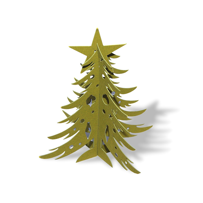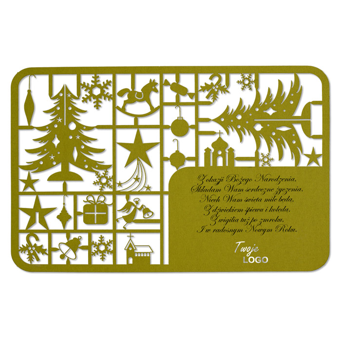 Nowoczesna kartka świąteczna w formie przestrzennej wycinanki, wykonana z matowego papieru barwionego w masie w kolorze oliwkowym. Na froncie znajduje się dekoracyjna kompozycja świątecznych symboli - od choinek i prezentów po gwiazdki i dzwonki. Po wyjęciu wycinanych elementów można samodzielnie złożyć trójwymiarową choinkę, widoczną na pierwszym ujęciu.