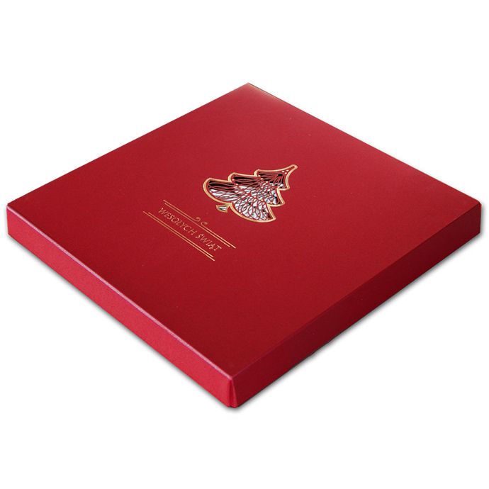 - Dekor: laserowo wycięta i złocona choinka + złoty napis "Wesołych Świąt"