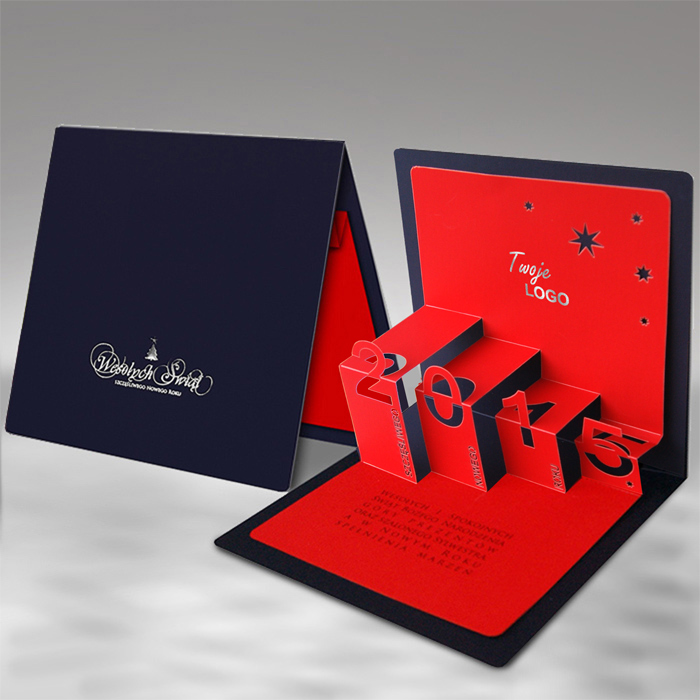 Zaskakująca forma i efektowny przekaz - ta kartka świąteczna w wersji 3D to propozycja dla tych, którzy chcą złożyć życzenia w oryginalny sposób. Granatowa, matowa okładka została ozdobiona eleganckim motywem świątecznym oraz napisem wykonanym metodą hot print w kolorze srebrnym. Wnętrze kryje przestrzenną konstrukcję z czerwonego papieru - wycięte schodki tworzą dynamiczną formę 3D, a umieszczony na nich tekst "Szczęśliwego Nowego Roku" podkreśla noworoczny charakter kartki.