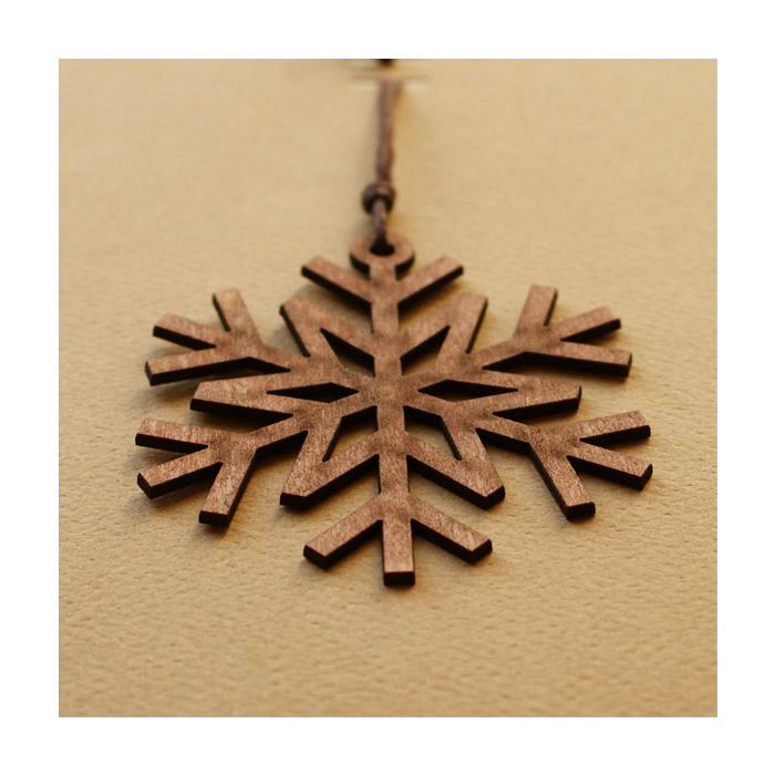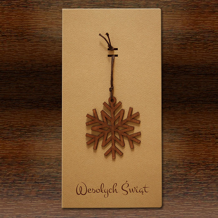 NOWOŚĆ!!! Kartka świąteczna z najnowszej kolekcji wykonana z bardzo sztywnego papieru. Dwustronna faktura o łagodnej strukturze nadaje niepowtarzalną estetykę papieru. Do okładki została przymocowana brązowym sznurkiem drewniana śnieżynka. Pod bombką znajduje się wykonany brązową folią napis "Wesołych Świąt" Wkładka do nadruku matowa w kolorze ecru.