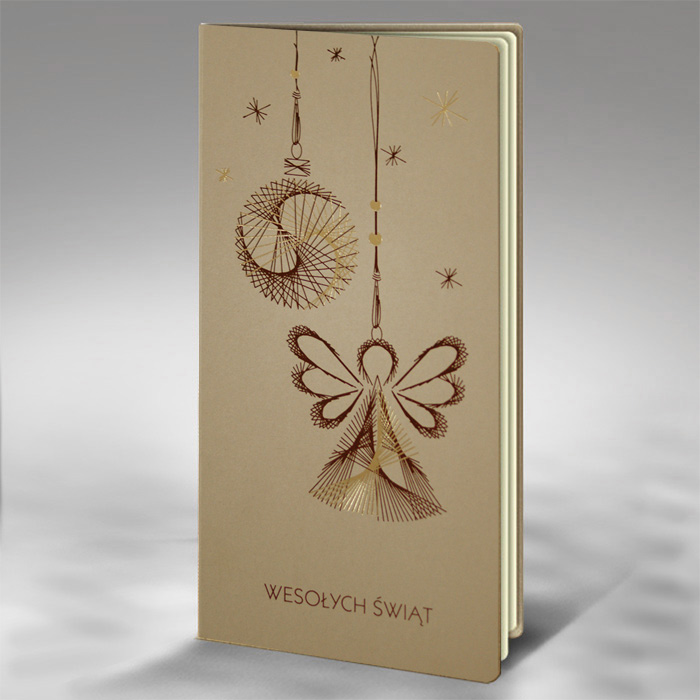 Elegancka kartka świąteczna wykonana z matowego papieru w kolorze beżowym. Na okładce znajduje się minimalistyczny, a zarazem efektowny motyw świąteczny - anioł oraz bombka, wykonane techniką hotstampingu przy użyciu dwóch kolorów folii: brązowej oraz złotej. Napis "Wesołych Świąt" również uszlachetniono złoceniem.