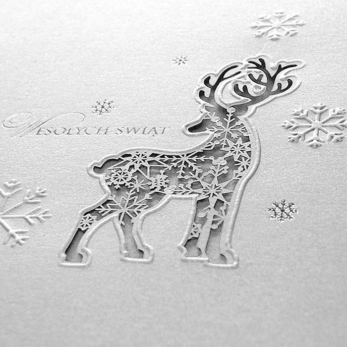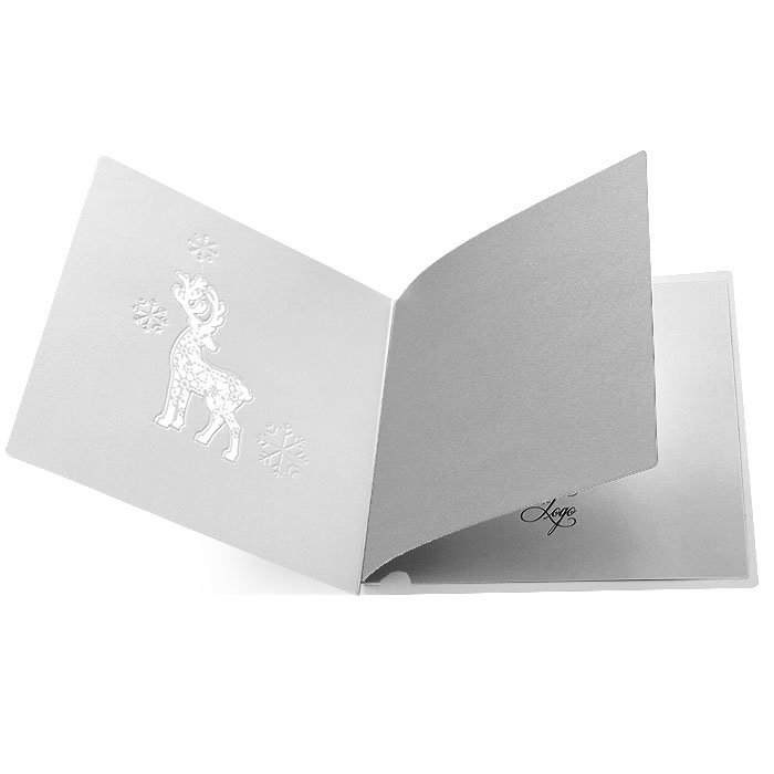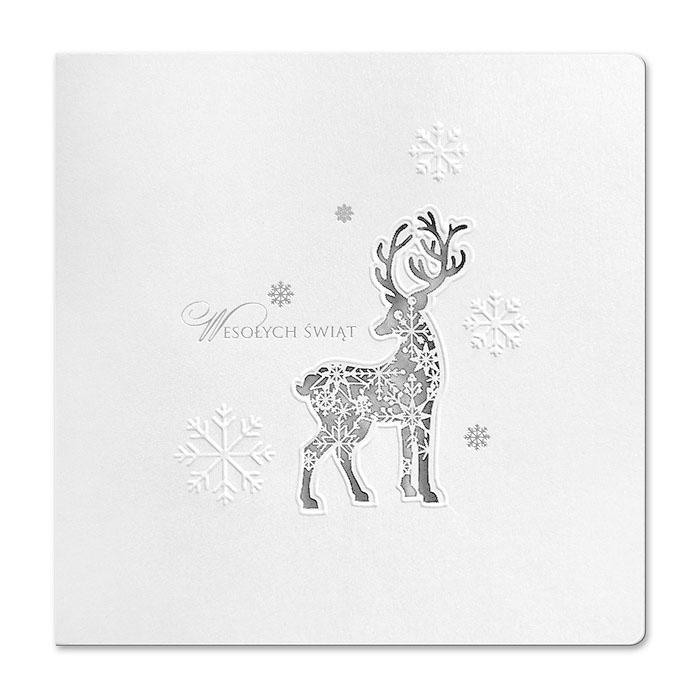 Subtelna i pełna klasy kartka świąteczna z delikatnym motywem renifera, który powstał dzięki precyzyjnemu cięciu laserowemu. Na tle białej, metalizowanej okładki barwionej w masie efektownie prezentuje się srebrny renifer o dekoracyjnym wzorze przypominającym śnieżynki. Całość uzupełniają tłoczenia i drobne, srebrzone akcenty, które podkreślają zimowy charakter projektu. Wnętrze kartki stanowi metalizowana, srebrna wkładka przeznaczona do nadruku życzeń.