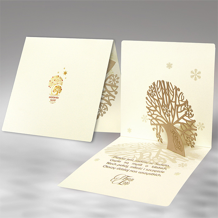 Nowoczesna kartka świąteczna, która zachwyca subtelnością formy i przestrzenną konstrukcją. Wykonana z matowego papieru w odcieniu jasnego beżu, ozdobiona na okładce świątecznym motywem stylizowanych drzewek, wykonanym techniką hot print w kolorze złotym i czerwonym. Po otwarciu kartki ukazuje się efektowne trójwymiarowe drzewo wycięte laserowo, uzupełnione nadrukiem cienia i delikatnych śnieżynek wewnątrz. Miejsce na życzenia i logo nadrukowywane jest bezpośrednio na papierze.