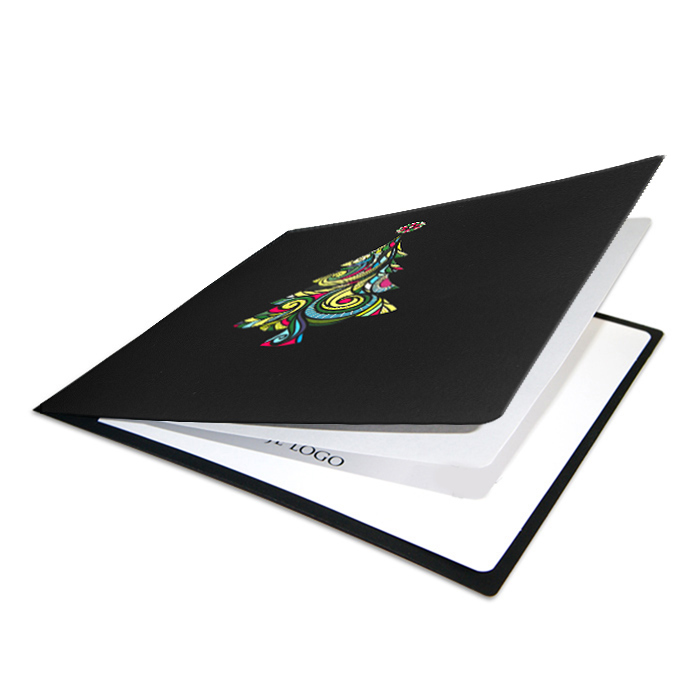 Nowoczesna kartka świąteczna, która zachwyca intensywną kolorystyką i oryginalną formą. Na aksamitnej, czarnej okładce o gumowanej strukturze znalazła się stylizowana choinka w energetycznych barwach - żółciach, turkusach, czerwieniach i zieleni - z subtelnymi, wysrebrzonymi akcentami. Całość prezentuje się niezwykle dynamicznie i świeżo, idealnie wpisując się w estetykę współczesnych projektów świątecznych.
