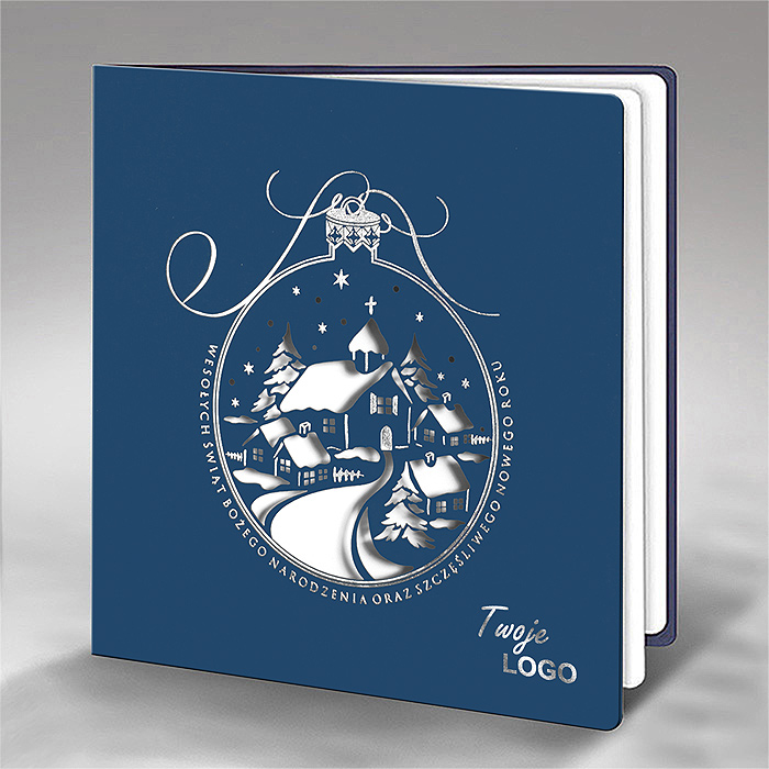 Elegancka kartka świąteczna wykonana z wysokiej jakości granatowego papieru o matowej, lekko gumowanej strukturze. Centralny element projektu stanowi precyzyjnie wycinana laserowo bombka, wewnątrz której znajduje się nastrojowy zimowy krajobraz: zaśnieżone domy, choinki i kościółek - całość wzbogacona o srebrzone detale, które pięknie odbijają światło.