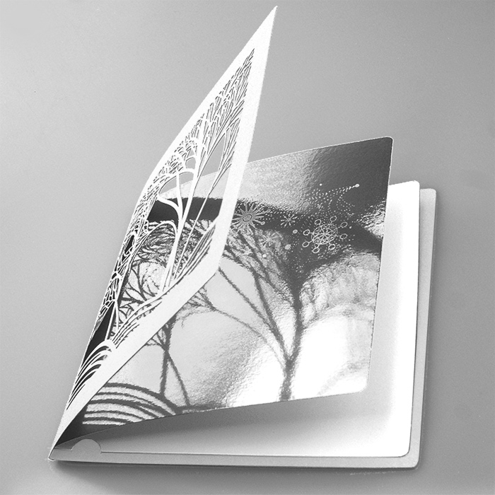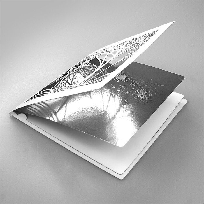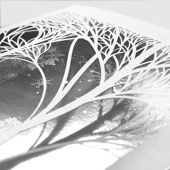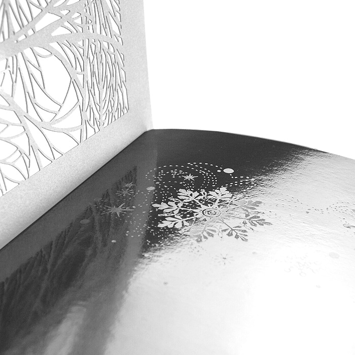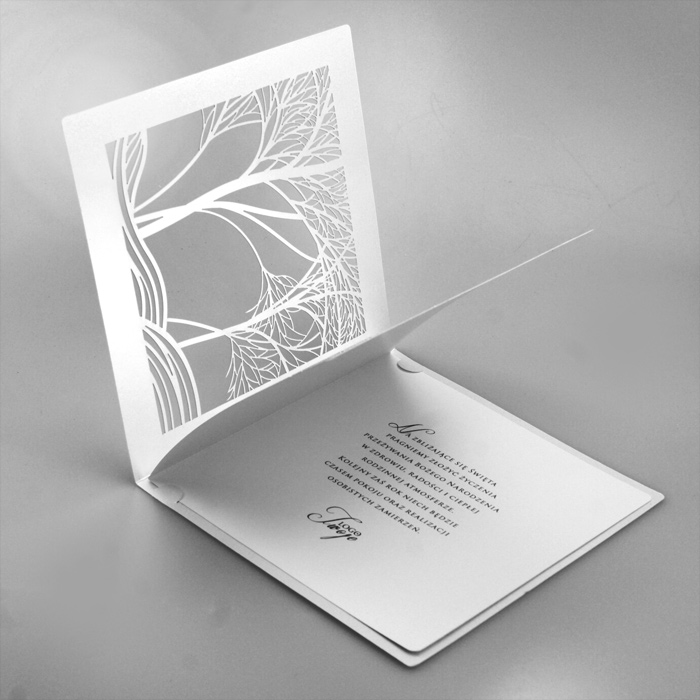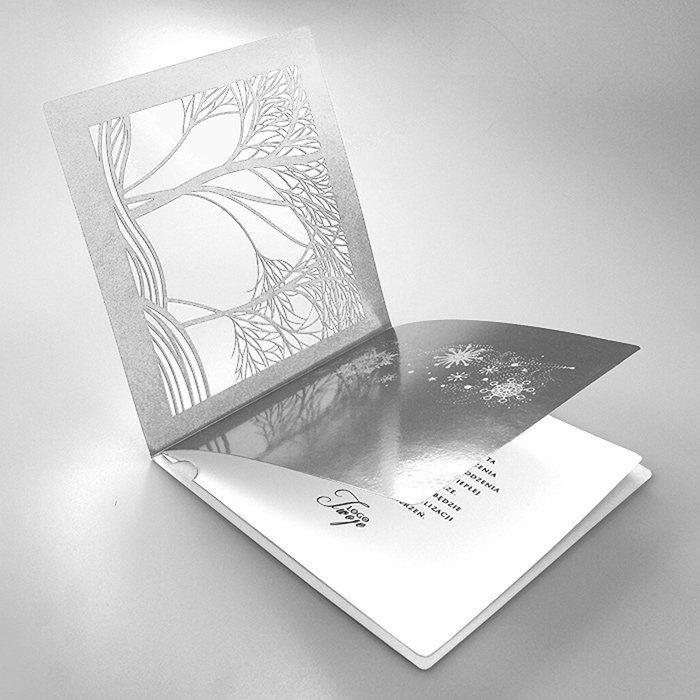 Elegancka kartka świąteczna wykonana z wysokiej jakości metalizowanego papieru w odcieniu śnieżnej bieli. Okładkę zdobi misternie wycięty laserowo motyw zimowych drzew, które tworzą subtelny pejzaż niczym z zimowej baśni. W tle połyskują srebrzone elementy, dodające głębi i uroku całej kompozycji. Wkładka do nadruku tekstu jednostronnie srebrzona, co pięknie dopełnia efekt wizualny całości.