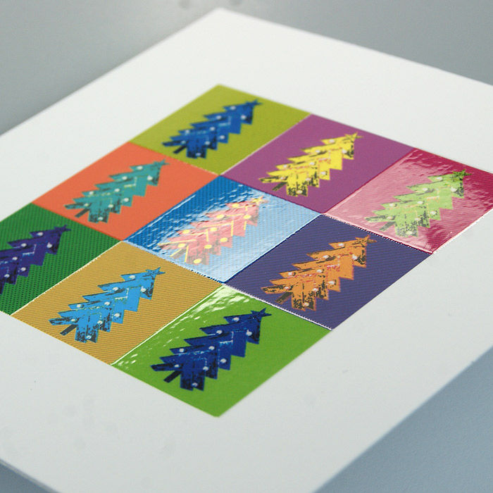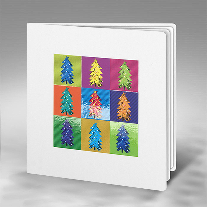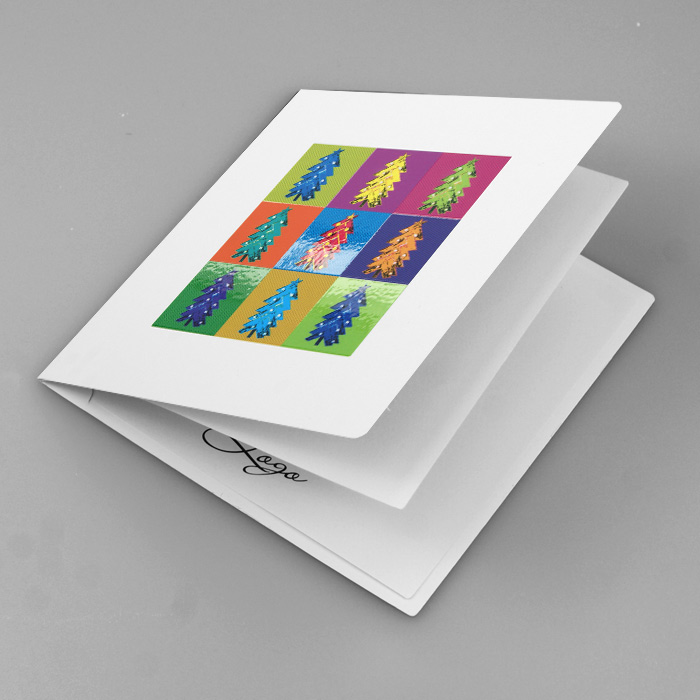 Pełna energii i koloru kartka świąteczna, która wyróżnia się nietypową grafiką nawiązującą do estetyki pop-artu. Na białej, matowej okładce znajduje się siatka dziewięciu barwnych kwadratów, z których każdy przedstawia inną wersję świątecznej choinki. Niektóre elementy grafiki zostały pokryte błyszczącym lakierem UV, co nadaje całości dodatkowej głębi i połysku. Idealna propozycja dla firm szukających odważnych, nowoczesnych rozwiązań graficznych.