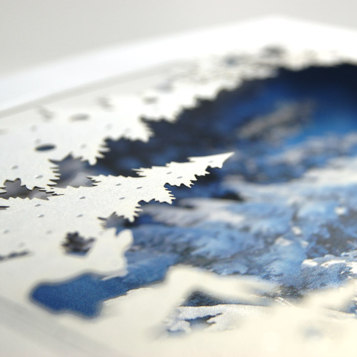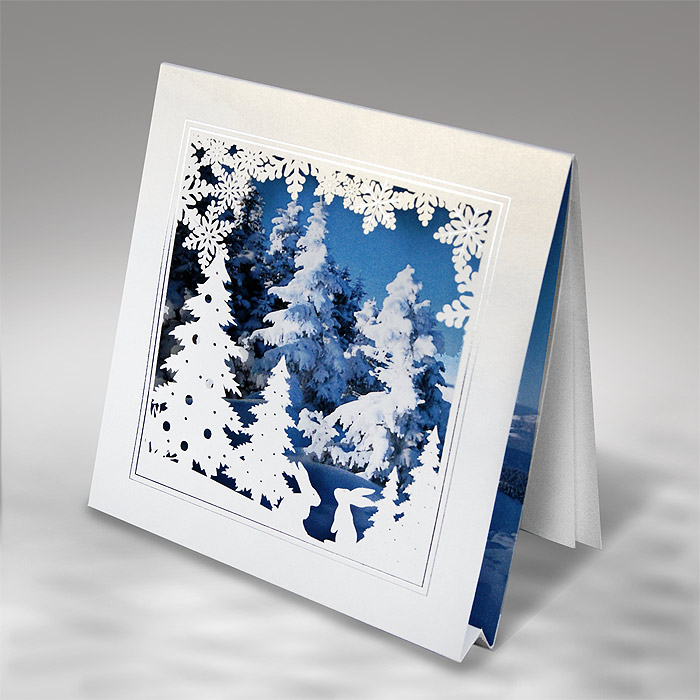 Wyjątkowa, trójwymiarowa kartka świąteczna wykonana z wysokiej jakości perłowego papieru w odcieniu czystej bieli. Okładkę zdobi precyzyjnie wycięta techniką laserową zimowa scenografia z choinkami i zajączkami, uzupełniona o subtelne detale uszlachetnione srebrną folią. W tle znajduje się drukowana ilustracja zaśnieżonego lasu, co tworzy efekt głębi i naturalnej przestrzeni. Całość prezentuje się elegancko i wyjątkowo estetycznie. Matowa, biała wkładka wewnętrzna pozwala na nadruk życzeń.