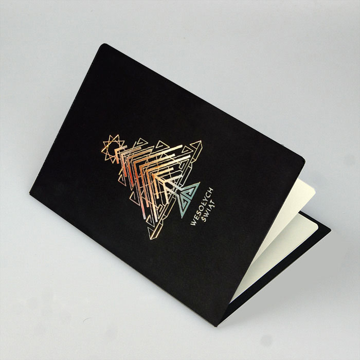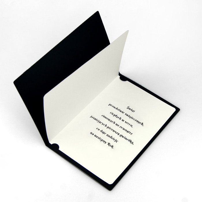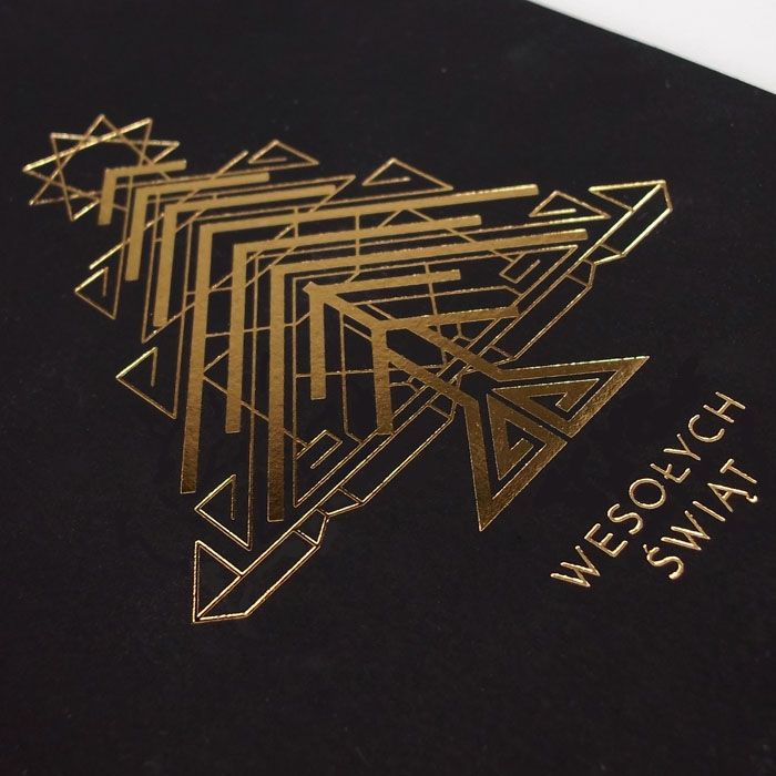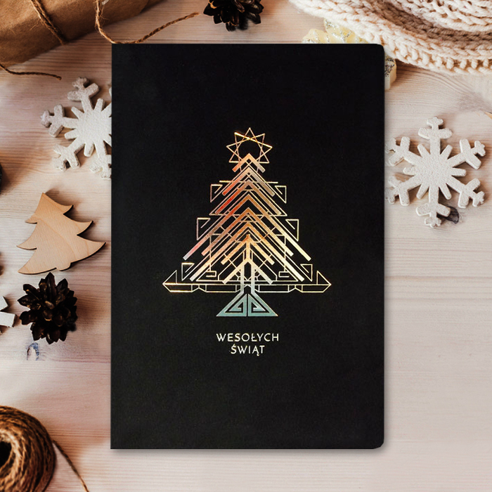 Nowoczesna kartka świąteczna o minimalistycznym charakterze, która przyciąga wzrok dzięki złoceniu w kształcie geometrycznej choinki. Czerń matowego papieru o lekko gumowanej strukturze stanowi eleganckie tło dla świątecznego motywu, który subtelnie mieni się w zależności od kąta padania światła. To propozycja idealna dla firm, które cenią nowoczesny design i chcą wyróżnić się niebanalną formą przekazu.