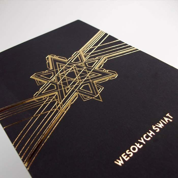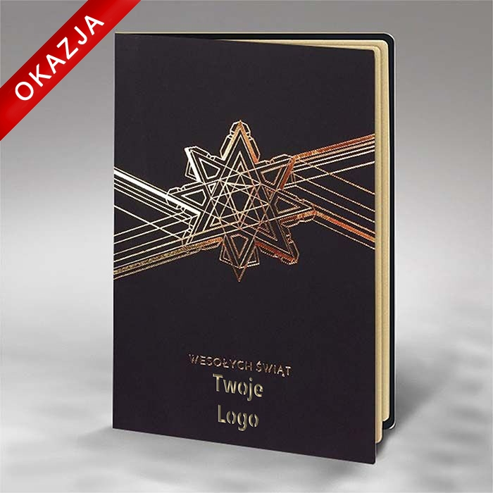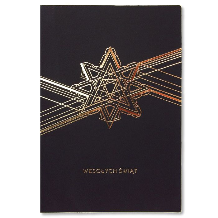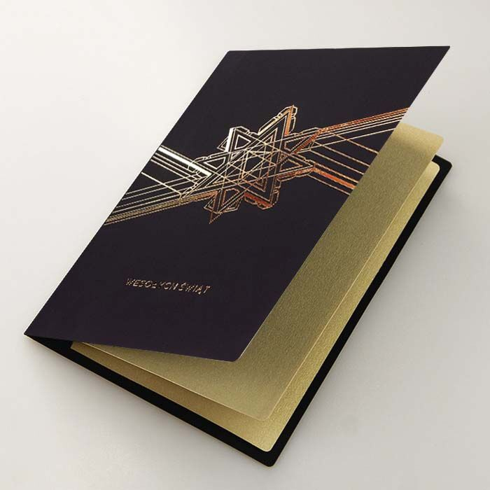 Nowoczesna i elegancka kartka świąteczna, która urzeka subtelnym blaskiem złoconej gwiazdy osadzonej w geometrycznym wzorze. Zastosowanie czarnego papieru o miękkiej, gumowanej strukturze nadaje projektowi wyjątkową głębię i kontrast, a złote linie wprowadzają poczucie harmonii i symetrii. Projekt doskonale sprawdzi się jako stylowy nośnik świątecznych życzeń biznesowych.