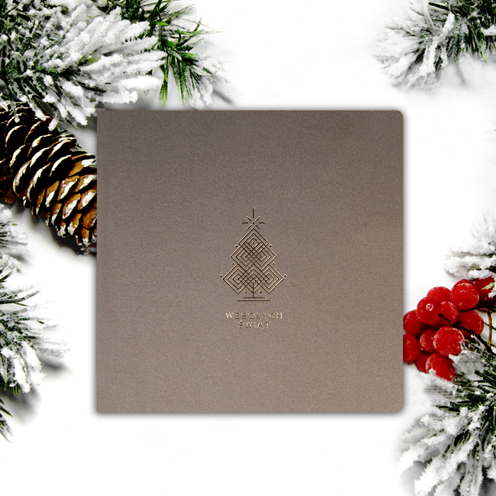 Wyjątkowa kartka świąteczna wykonana z innowacyjnego papieru w kolorze brązowym, z unikalnym efektem dotykowym i wizualnym. Okładkę ozdabia złocony ornament choinki.