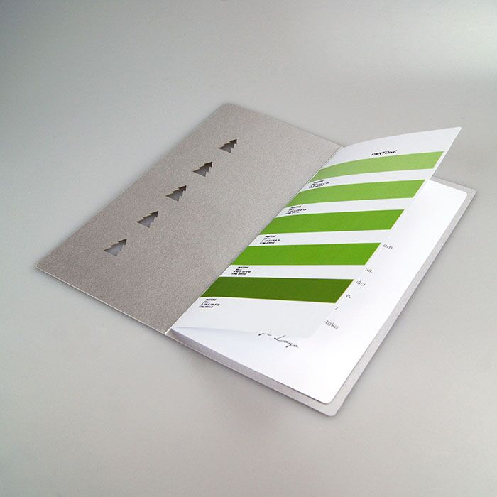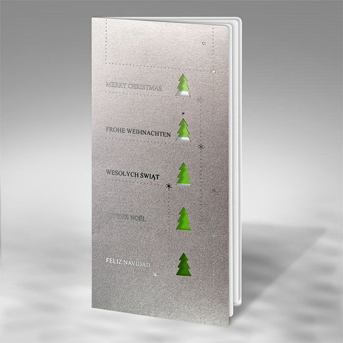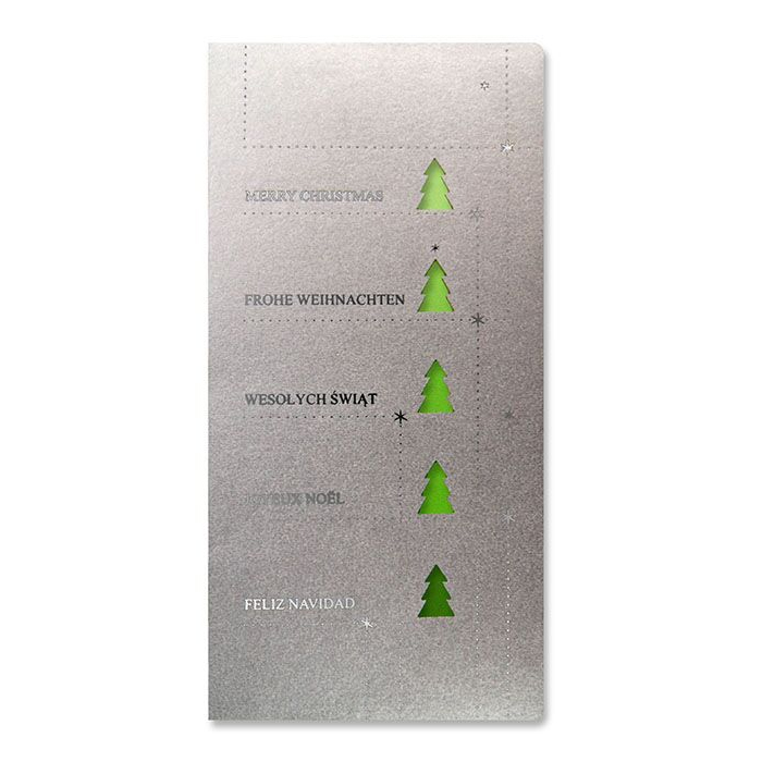 Nowoczesna, a zarazem subtelna kartka świąteczna, która łączy elegancję z odrobiną artystycznej zabawy kolorem. Na srebrnej metalizowanej okładce znajdują się wycięte laserowo choinki, przez które przebijają się odcienie zieleni przypominające próbnik pantone. Całość uzupełniają życzenia "Wesołych Świąt" w różnych językach, wykonane metodą hotstampingu - to projekt, który zachwyca koncepcją i starannością wykonania