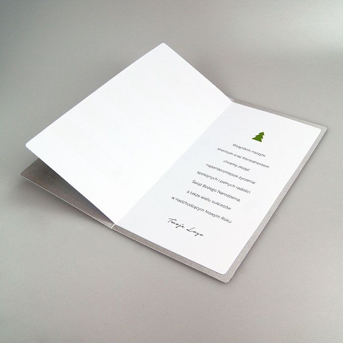 Okładka została wykonana z wysokiej jakości papieru metalizowanego o delikatnym połysku, który podkreśla świąteczny charakter projektu. Laserowe wycięcia choinek pozwalają zajrzeć do środka i dostrzec barwne przejścia na pierwszej stronie wkładki - od świerkowej zieleni po głęboką limonkę. Środek kartki jest biały, matowy, idealny do nadruku tekstu i logotypu.