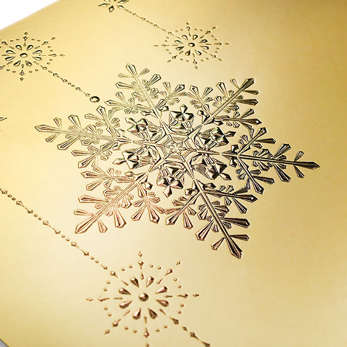 Szlachetna i niezwykle elegancka kartka świąteczna wykonana z wysokiej jakości papieru w odcieniu złota o delikatnym matowym wykończeniu. Okładkę zdobi finezyjnie zaprojektowany motyw śnieżynek, które wykonano z najwyższą precyzją techniką hotstampingu oraz tłoczenia. Śnieżynki lśnią subtelnym blaskiem, tworząc kompozycję, która łączy w sobie lekkość zimy z urokiem świątecznej oprawy. Biała, matowa wkładka pozwala na nadruk indywidualnych życzeń oraz logotypu.