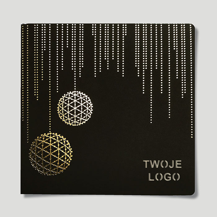 Minimalistyczna, a zarazem wyrazista kartka świąteczna wykonana z matowego papieru barwionego w masie o gumowej strukturze w kolorze głębokiej czerni. Na froncie znalazły się dwie stylizowane bombki w geometrycznej formie, wykonane złotą folią metodą hotstampingu. W górnej części kartki - regularny wzór kropli przypominających opadające światło, który nadaje projektowi nowoczesnego charakteru. Całość harmonijnie łączy się z elegancką wkładką w odcieniu starego złota.