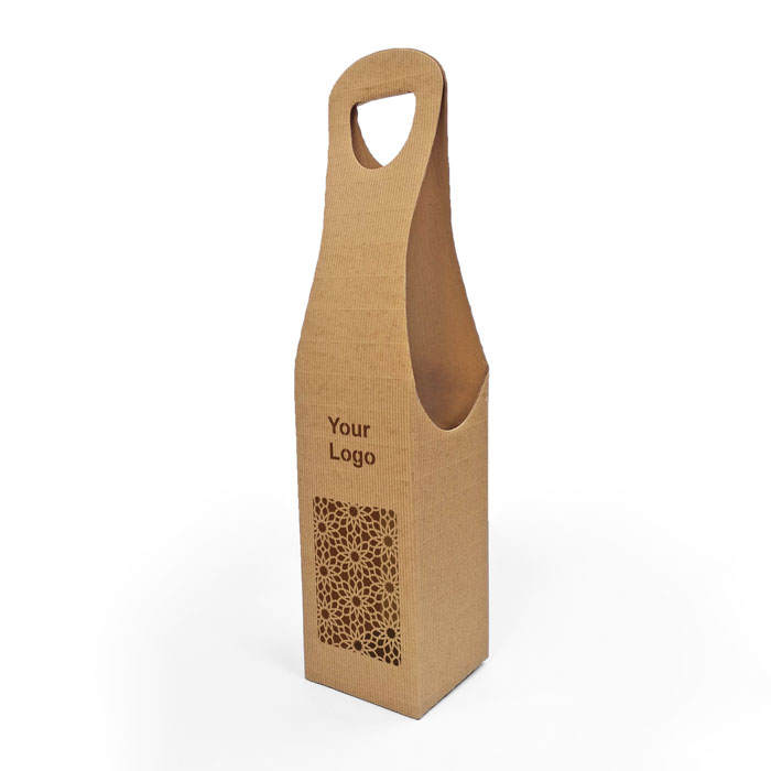 Stylowe opakowanie na wino wykonane z naturalnej tektury falistej. Front ozdobiony misternym, koronkowym wzorem wycinanym laserowo - przyciąga wzrok i nadaje całości subtelnej elegancji. Możliwość dodania logo czyni ten model doskonałym wyborem na upominek firmowy.